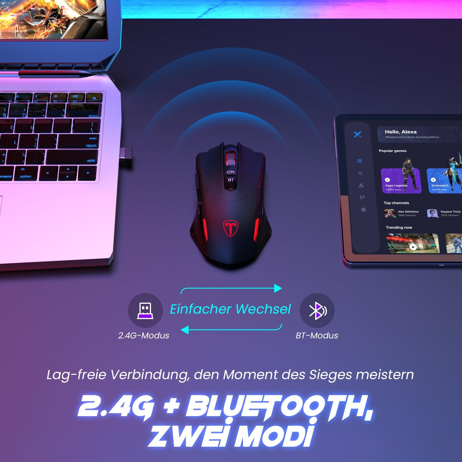 【Dual Connection Methods】RisoPhy Wireless Gaming Mouse features dual connectivity with plug-and-play 2.4G connectivity for your convenience, ensuring you get a stable and fast control experience during gaming. Bluetooth connectivity offers excellent compatibility, allowing you to switch between laptops, tablets and other devices with ease