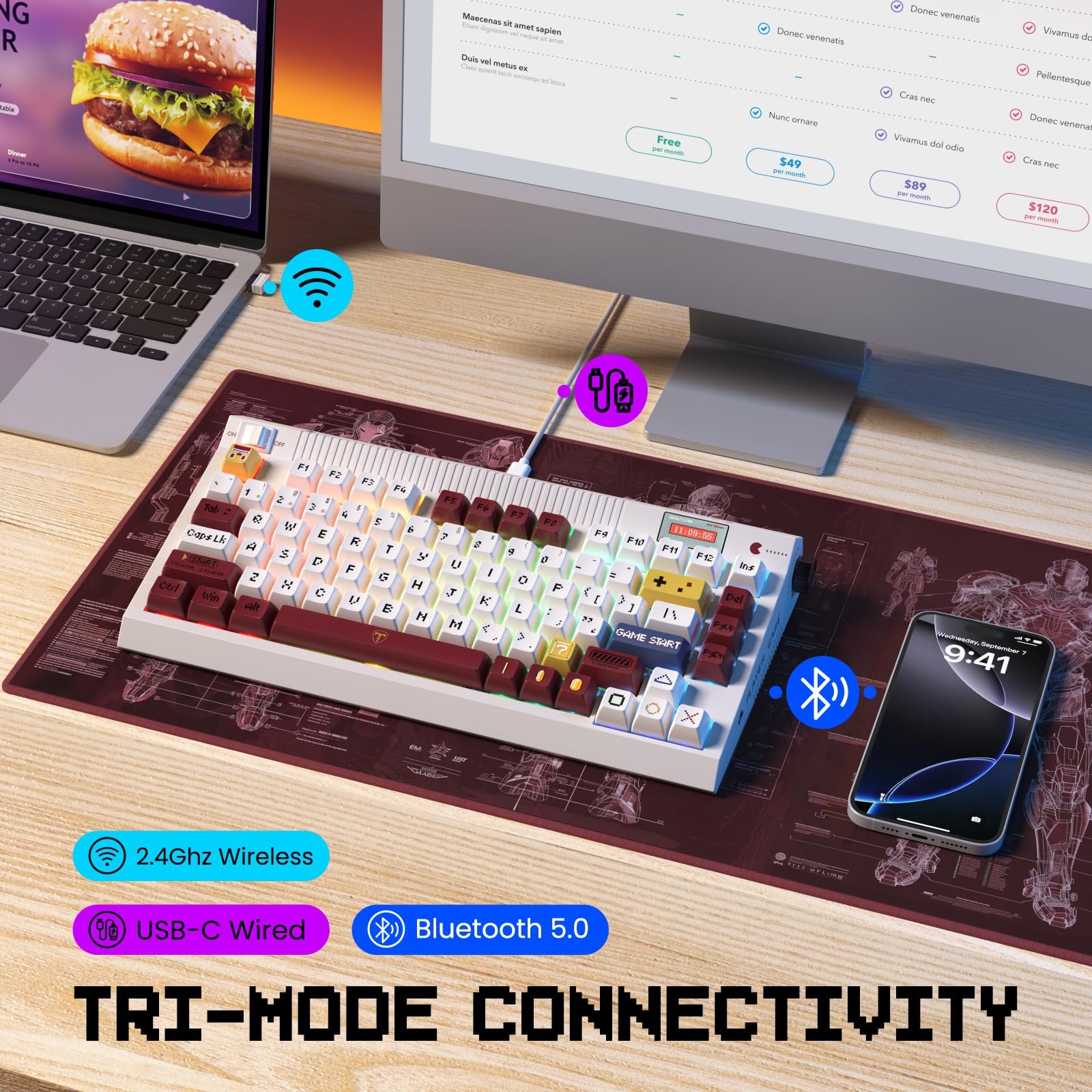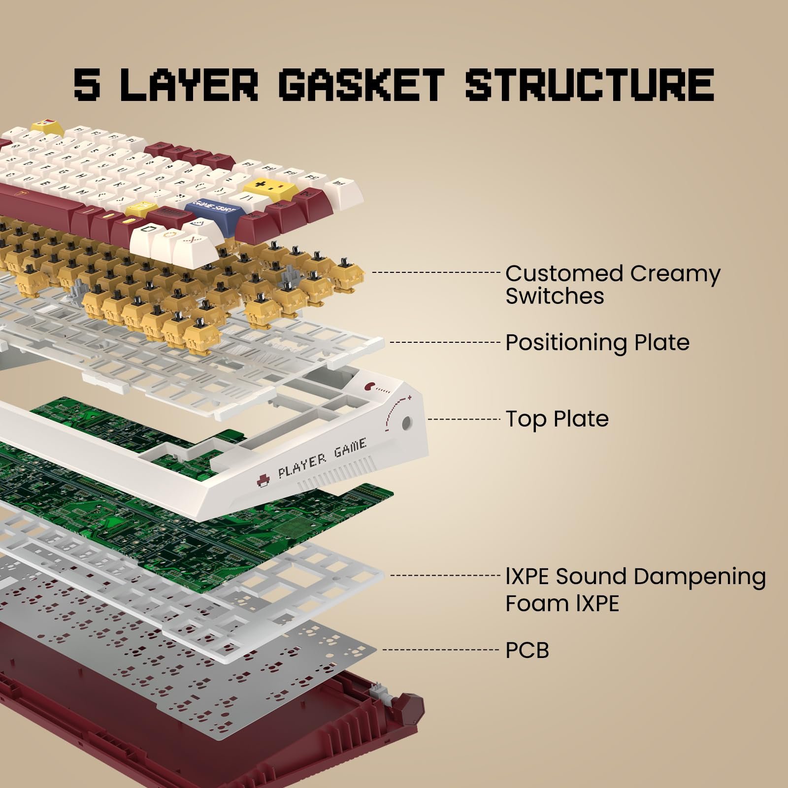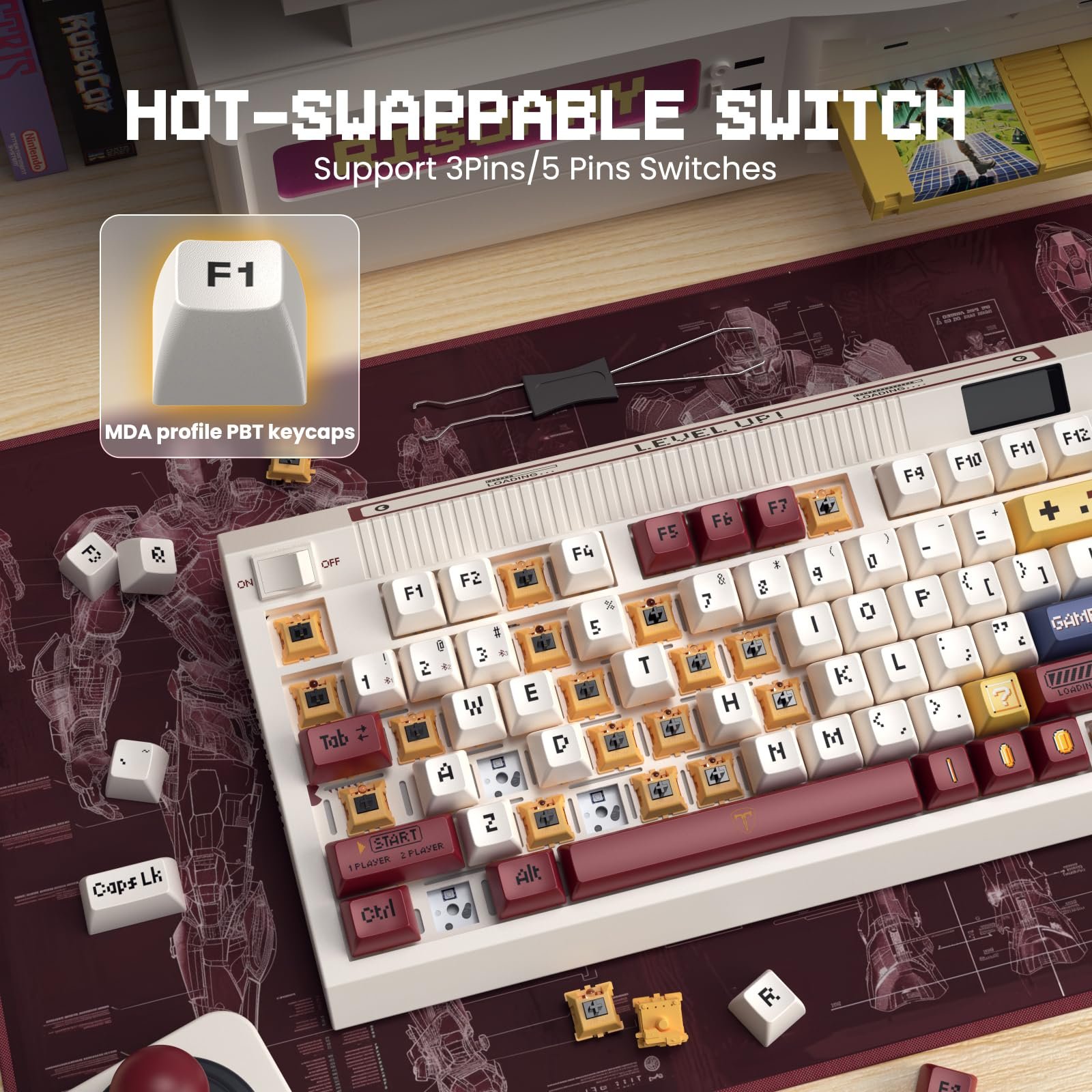 Retro Typewriter Theme Aesthetic Keyboard: This wireless creamy keyboard embraces a classic retro gaming theme, featuring high-quality PBT keycaps with MDA profile and full-key thermal sublimation.The design pays homage to the golden era of gaming in the 80s and 90s.