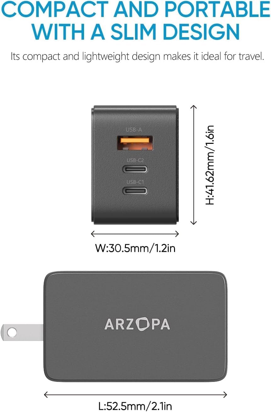 65W USB C Charger Block, ARZOPA GaN Fast Charger USB C Wall Charger PPS 3-Port Foldable Plug for MacBook Pro/Air, iPad Pro, iPhone 15/Pro, Galaxy S24 Ultra, Dell XPS 13, Pixel, Monitor