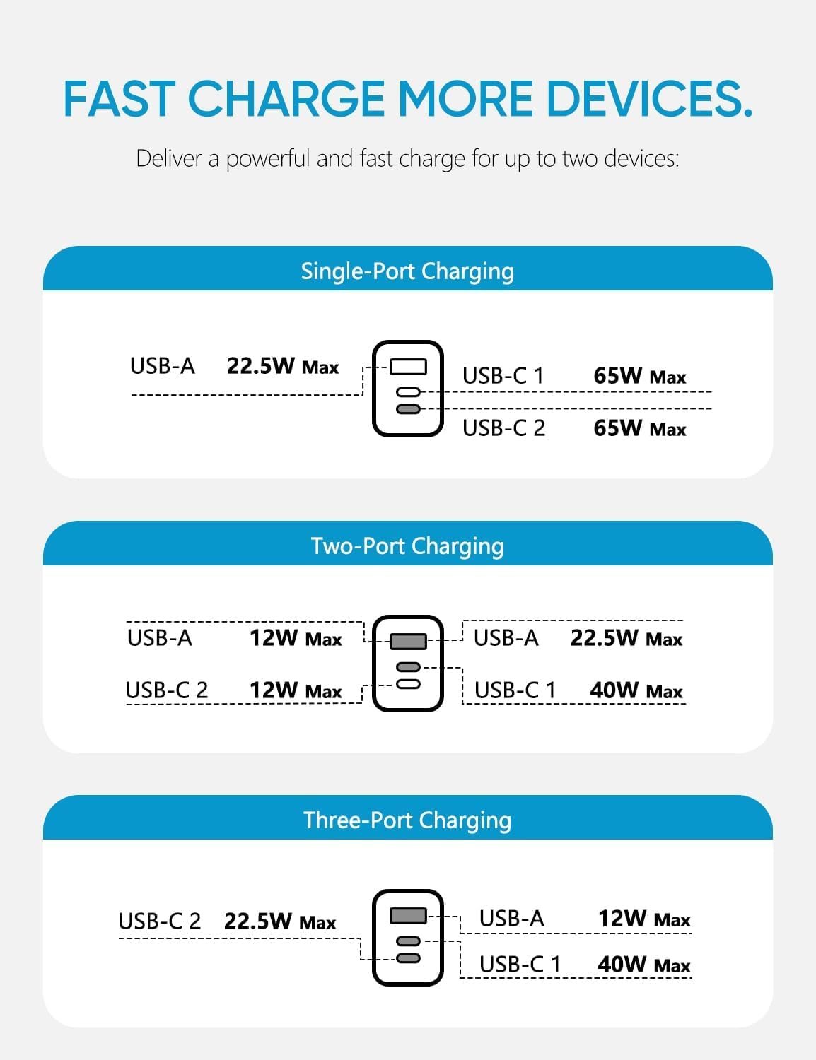 SUPER FAST CHARGING: When you connect a single device, you can experience super fast charger with a maximum power of 65W. Both the C1 and C2 ports deliver an impressive 65W each, while the A1 port provides a still-speedy 22.5W. Get your devices powered up quickly with this high-speed charging solution