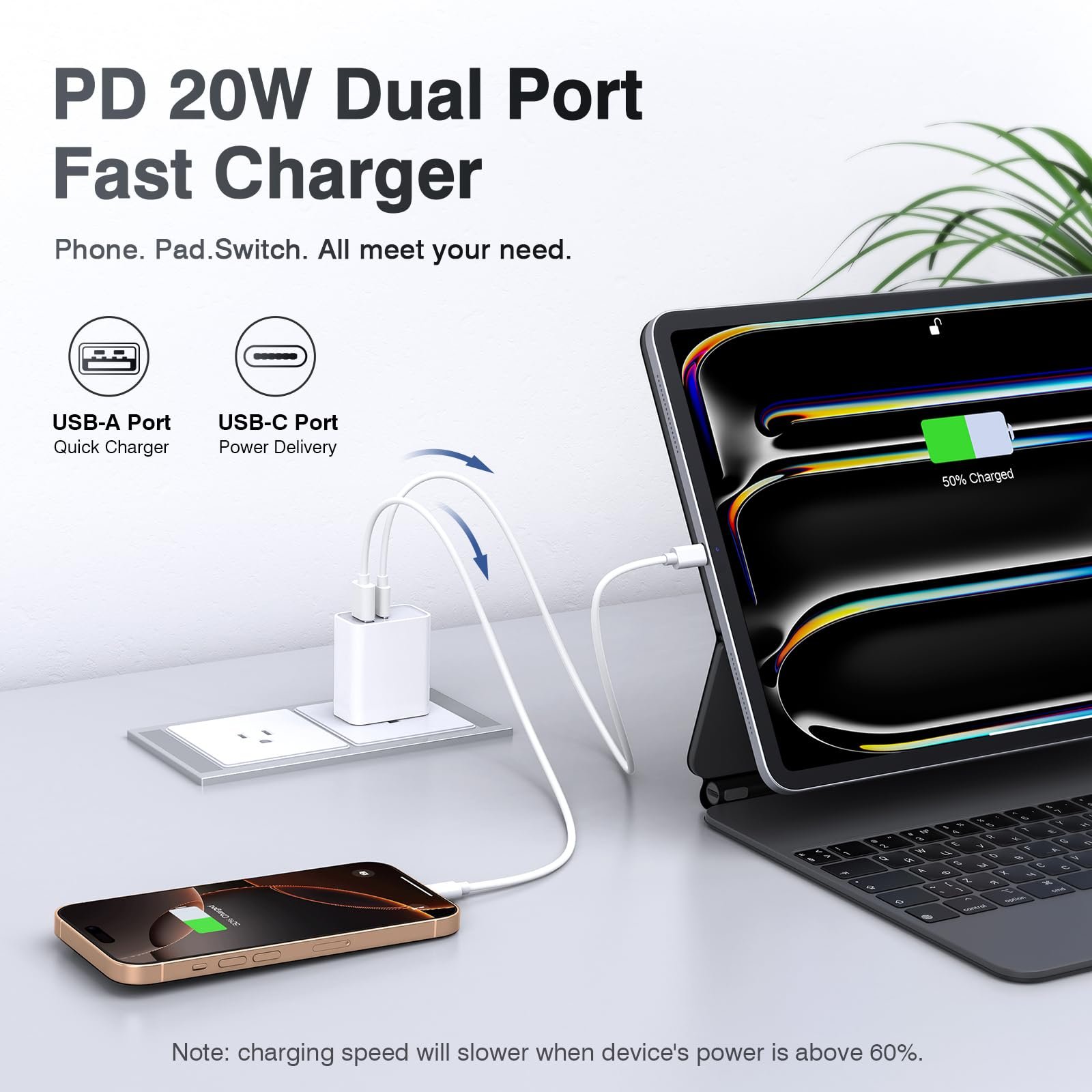High-Speed Charging: The USB-C port supports a maximum power output of 20W. Dual-port design with USB-C and USB-A,charge two devices at the same time to minimize waiting time and frees you from messy chargers with various interfaces