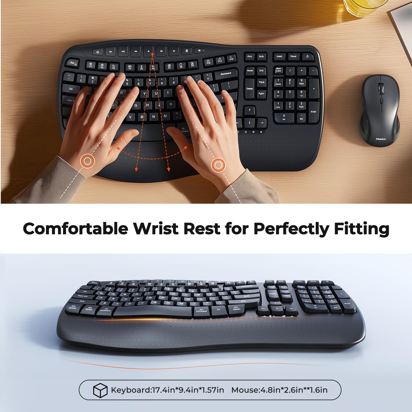 MEETION Ergonomic Keyboard and Mouse Wireless Combo, Wave Keys Natural Typing, 2.4G USB Receiver Wireless Keyboard with Wrist Rest, 4 Adjustable DPI Optical Mouse, Computer/Laptop/Windows/Mac, Black