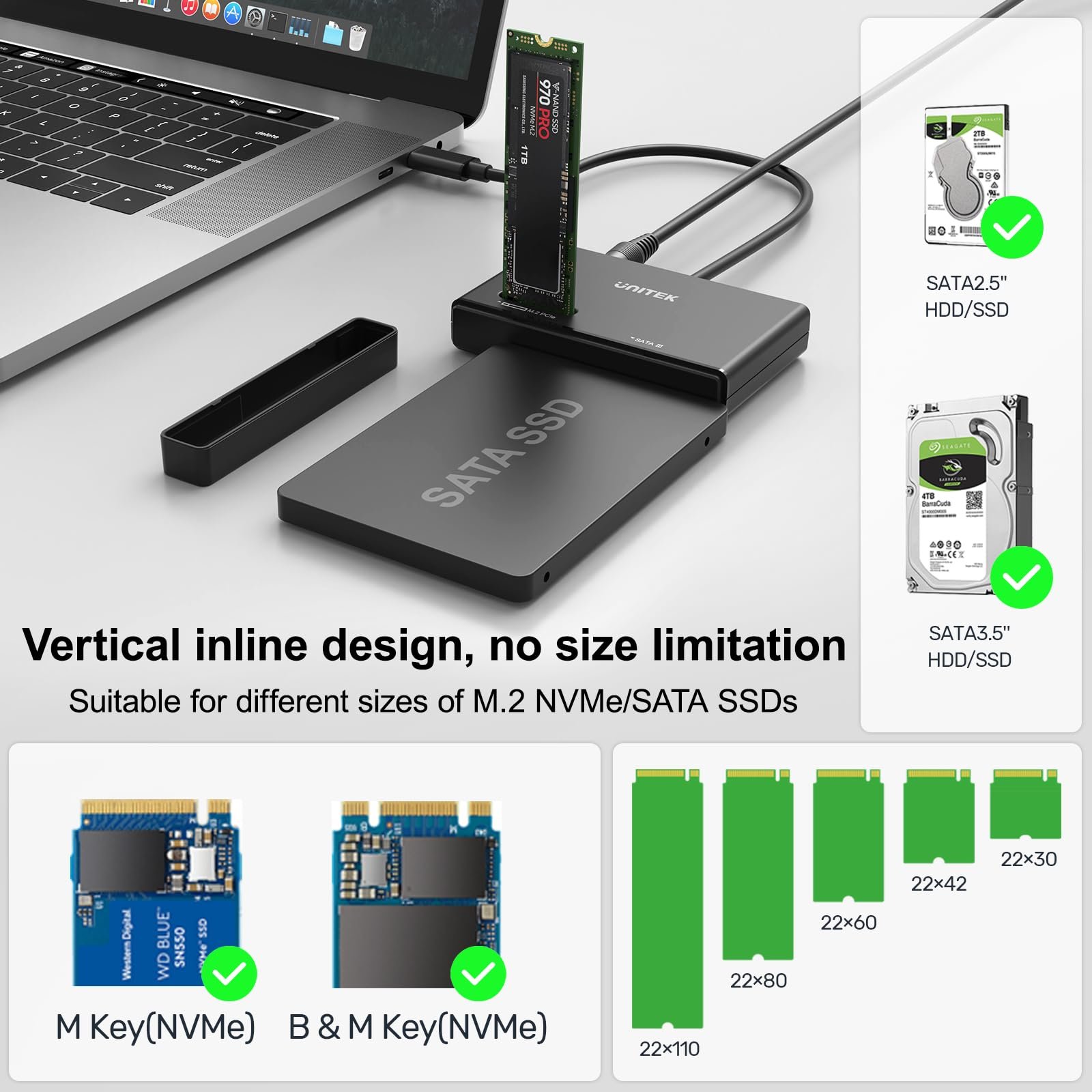 Unitek M.2 NVMe SSD Enclosure Adapter – 10 Gbps Hard Drive Reader Tool Free Pcie NVMe Adapter External USB 3.2 M2 SATA Case Converter Supports M Key Any Sizes M.2 2.5″ /3.5″ SATA Solid State Drive