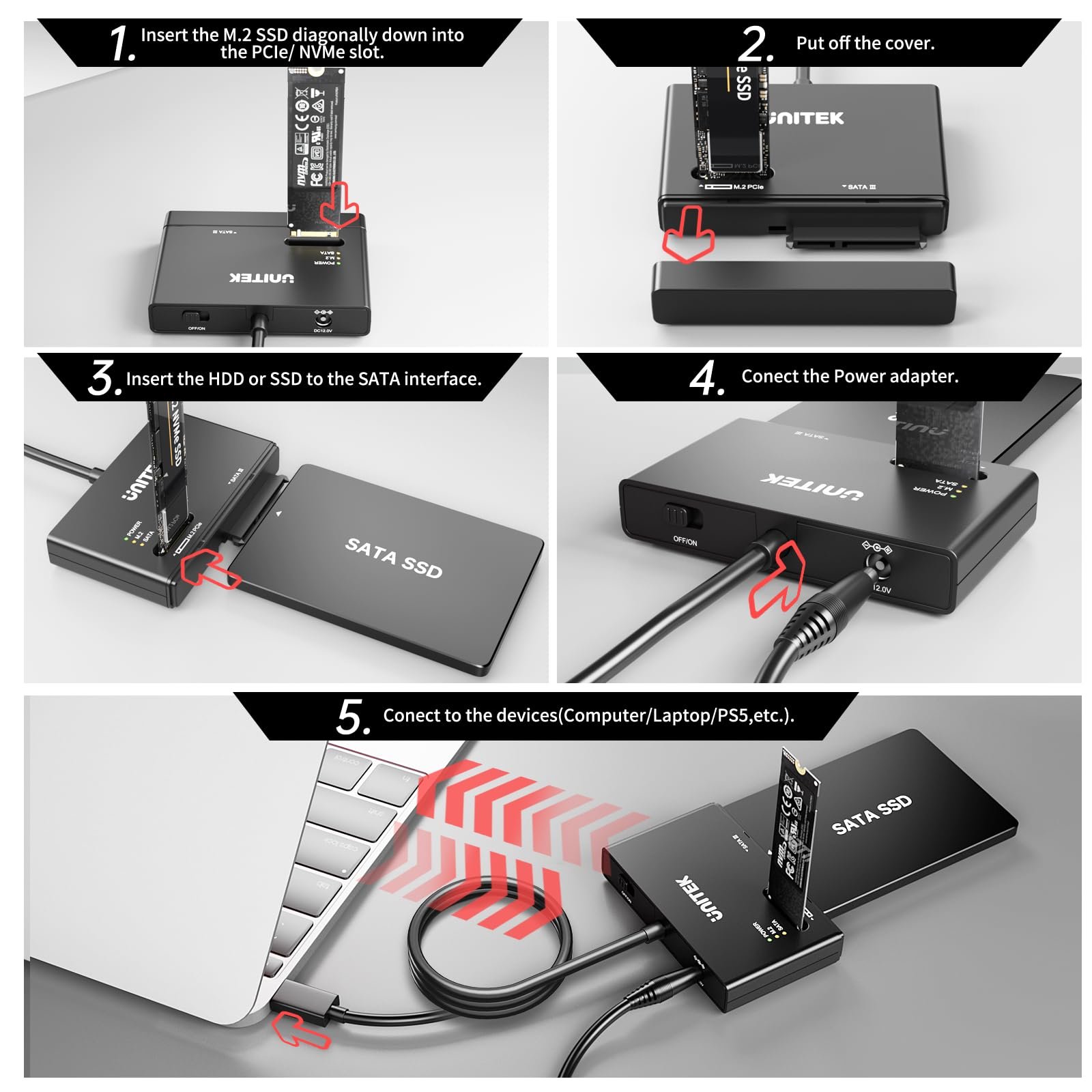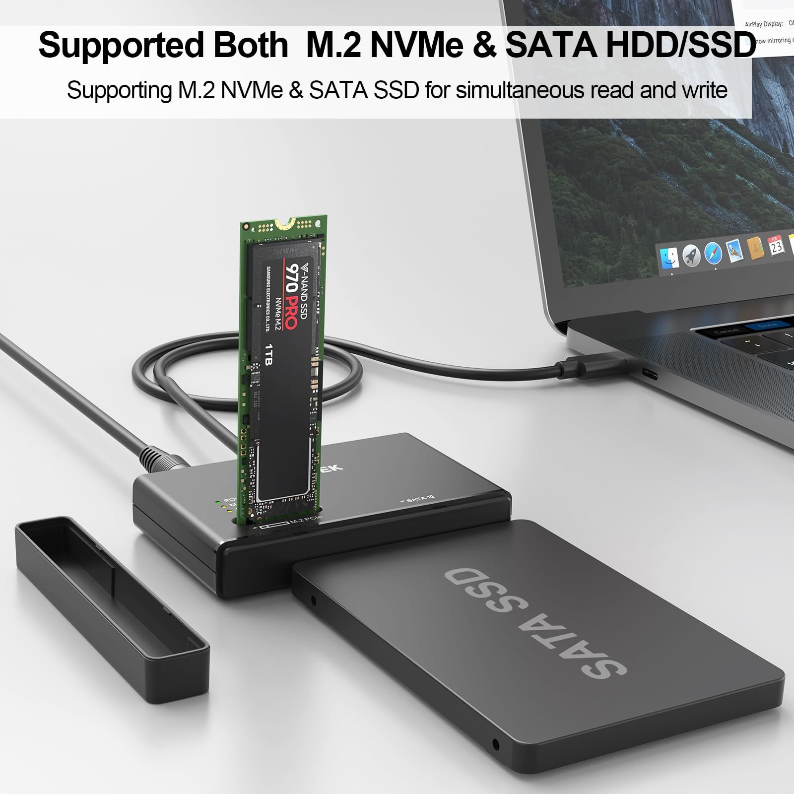 【Tool-Free NVMe SSD USB Adapter】The M.2 Duplicator is so easy to use without any tools and no driver required, Simply open the dust cover of the USB Drive Case to insert a SATA SSD, M2 SSD can be inserted directly into the external NVMe enclosure, and the open design is compatible with any size of M.2.