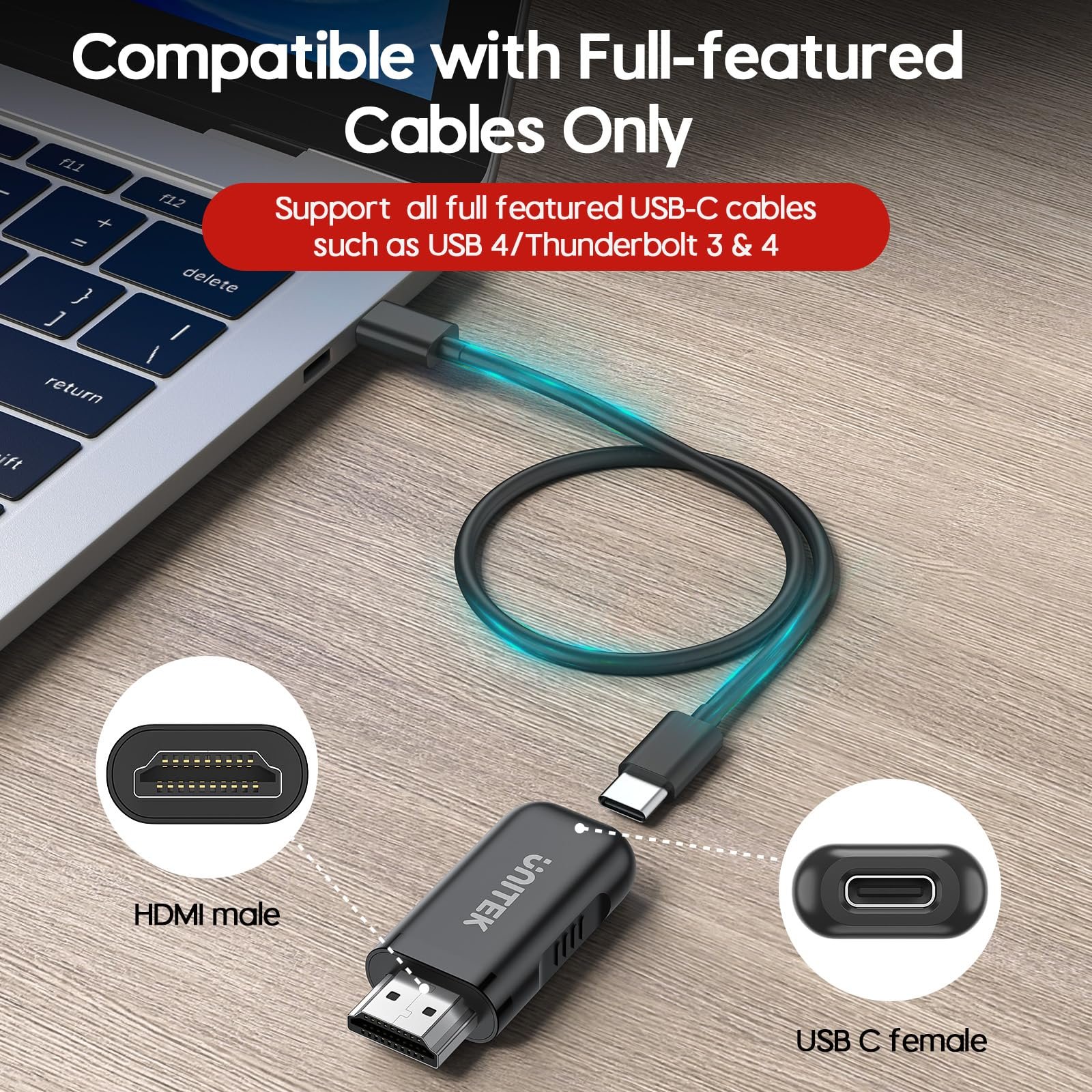NOTE: Only work with the full featured USB-C cables ! Only Compatible with Full Featured USB-C Cables: Make sure to use a USB-C cable that fully supports functionalities like USB 3.1/4.0 and Thunderbolt 3/4 for optimal performance and video transmission. This adapter is compatible with all USB-C devices that support “DP Alt Mode” and Thunderbolt 3/4 ports.