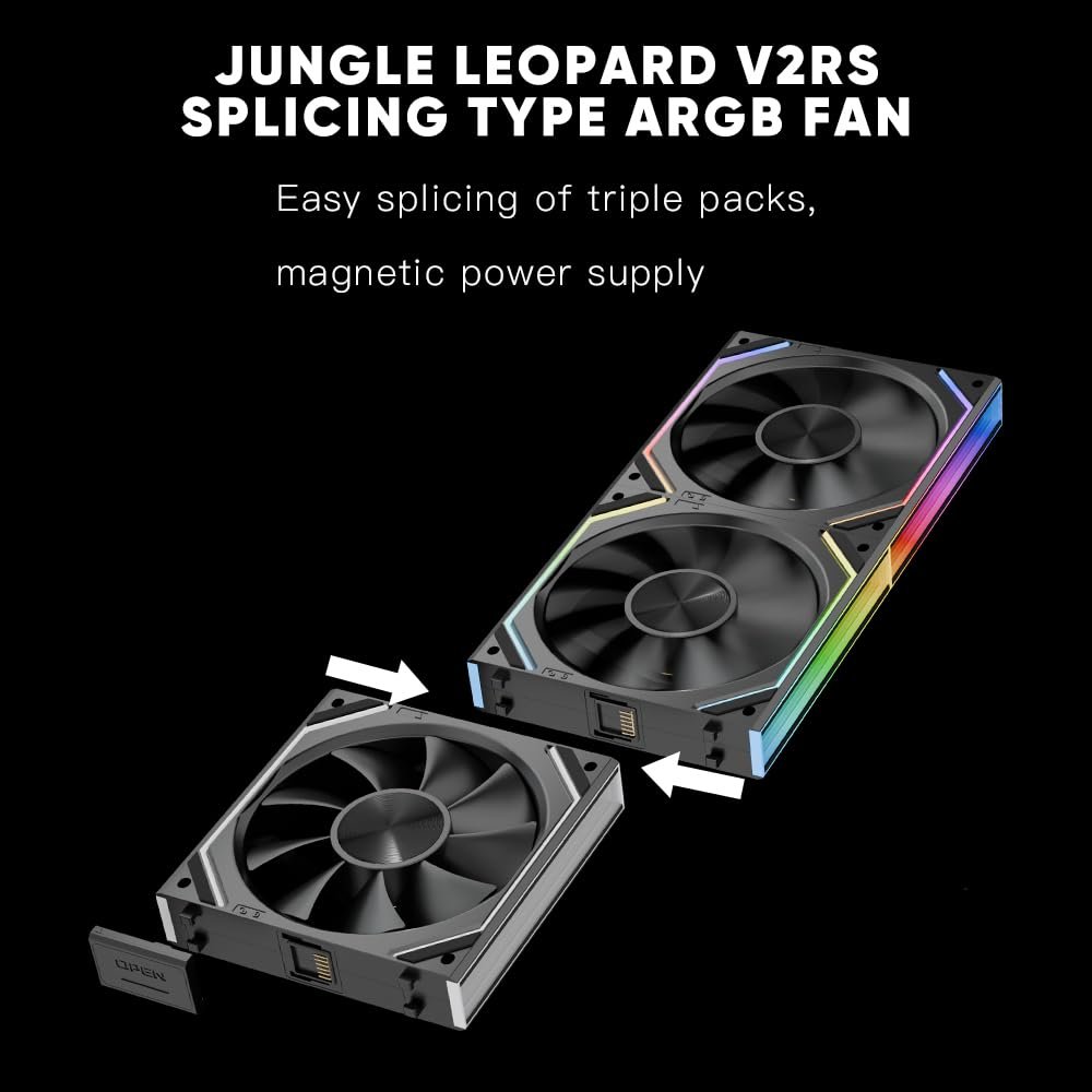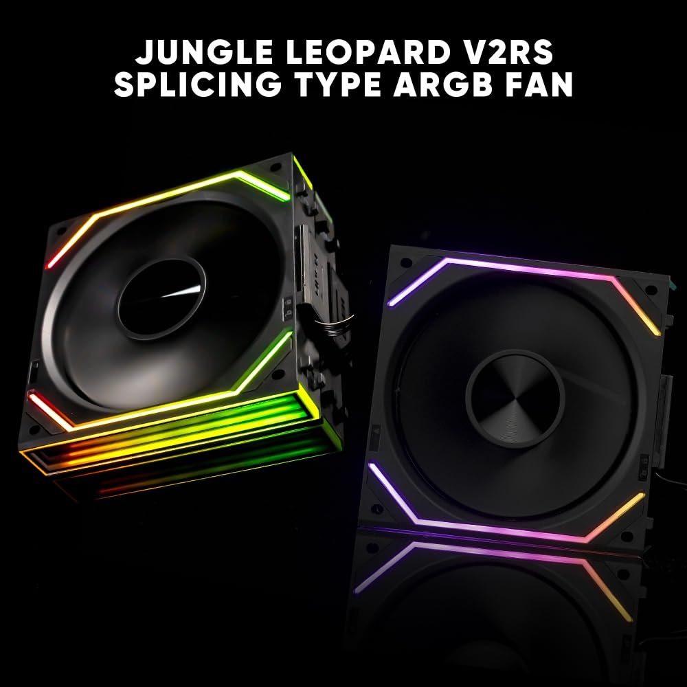 The latest Jungle Leopard FAN JM-V2 RS 120 case fan is different from the first generation, its lighting is more beautiful and soft, and we have upgraded its cable (with nylon mesh security, more durable).In terms of side infinity mirror splicing, the latest generation of JM-V2 RS has a stronger overall lighting effect.And it has upgraded its fan design to provide more airflow to your case with the same noise