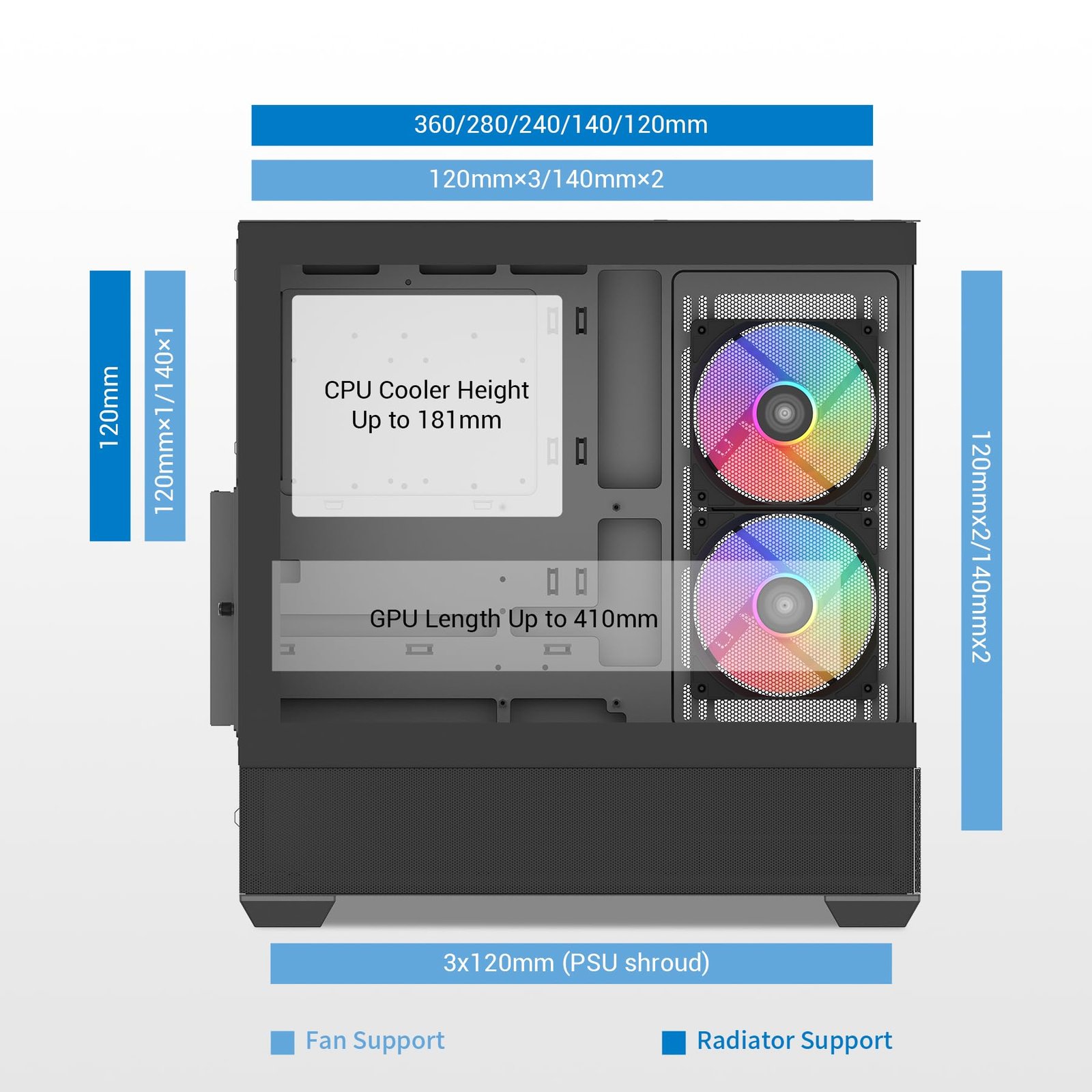Efficient Cooling with 6 ARGB PWM Fans: The SAMA V40 mid tower ATX case comes pre-installed with 6 high-performance 120mm ARGB PWM fans (3 bottom, 2 side, 1 rear) and supports 360mm water cooling on top, delivering exceptional heat dissipation and stunning lighting effects. With support for up to 9 fans, this mid tower PC case ensures your high-performance system stays cool even under heavy loads.