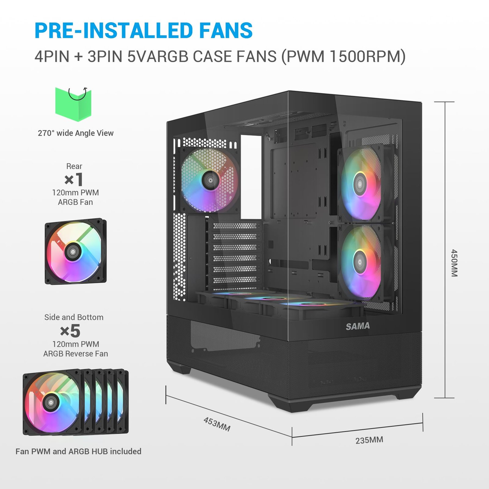 SAMA V40 Mid Tower ATX Case – 6 × 120mm ARGB PWM Fans Pre-Installed, Dual Tempered Glass Panels, Vertical Airflow, Dual-Chamber Design, USB 3.1 Type-C, 7 Slots, Supports ATX/MATX/ITX GPUs, Black