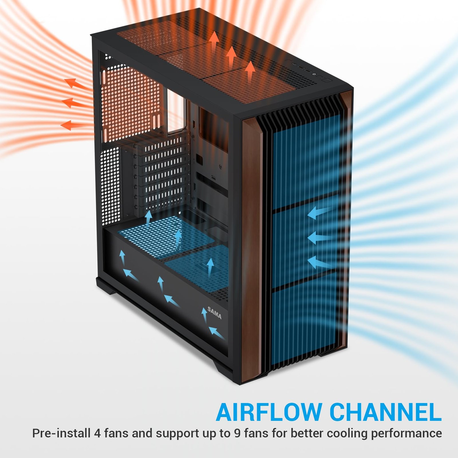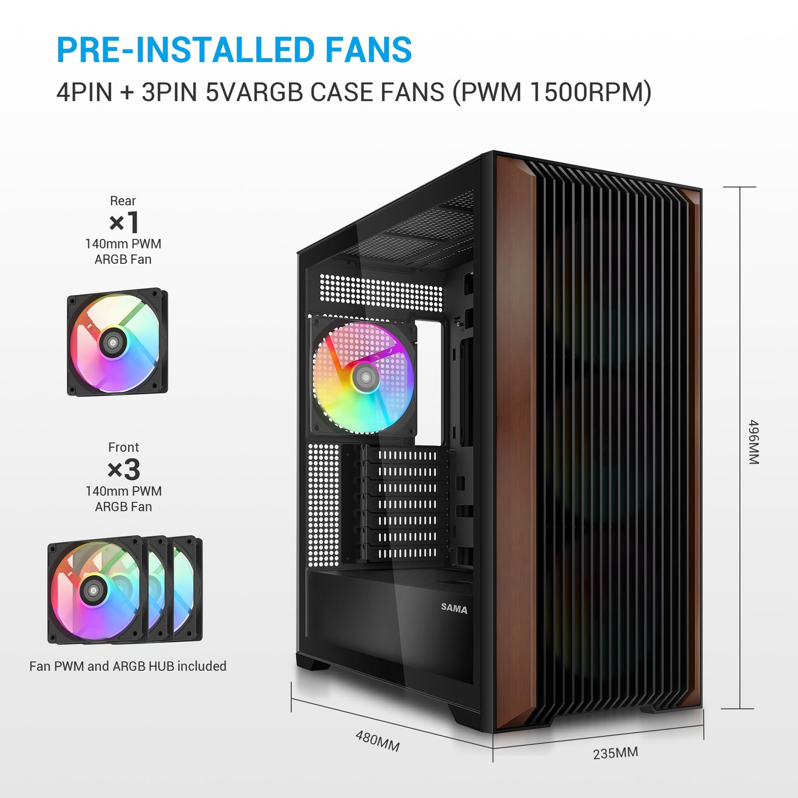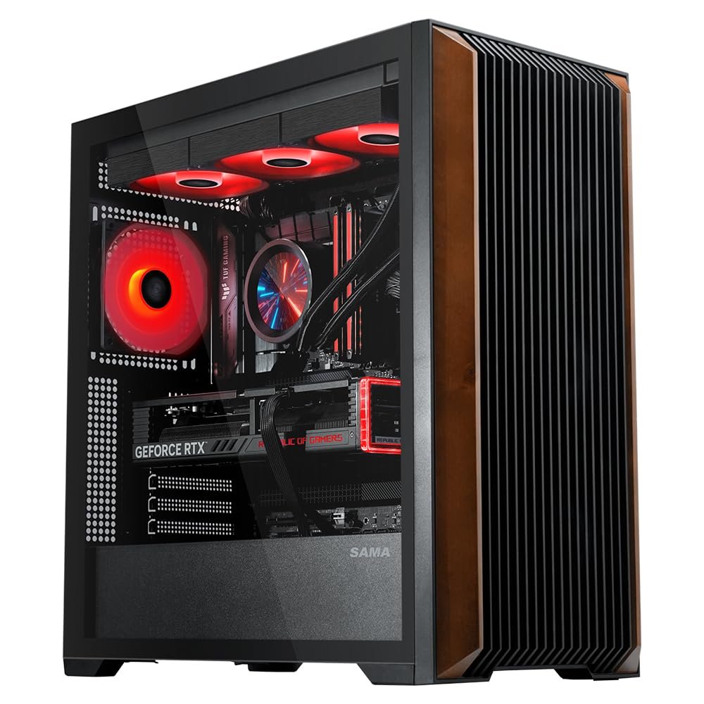 SAMA Z60 Genuine Walnut Wood PC Case, ATX Mid Tower PC Case, Pre-Installed 4X 140mm ARGB PWM Fans, Supports 360mm Radiator on Top, Type-C Port, Mid Tower Computer Case-Black