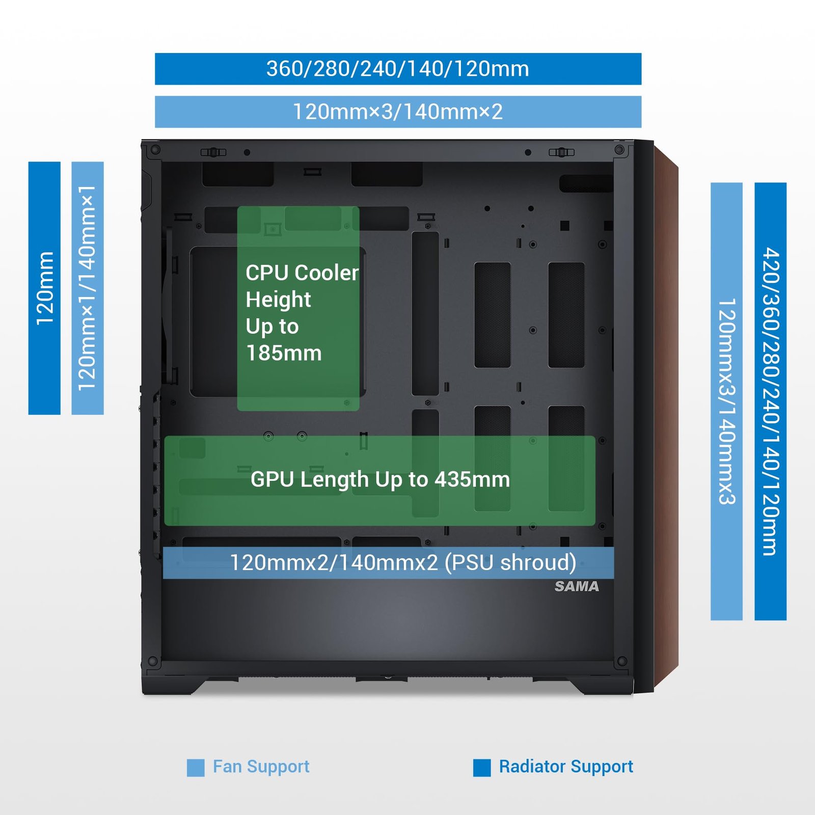 Efficient Cooling Performance: SAMA Z60 comes pre-installed with 4x 140mm ARGB PWM fans, delivering efficient cooling with airflow optimized for high-performance systems. Supports up to 3x 120mm or 2x 140mm front fans, 360mm radiator on top, and additional bottom fan options.