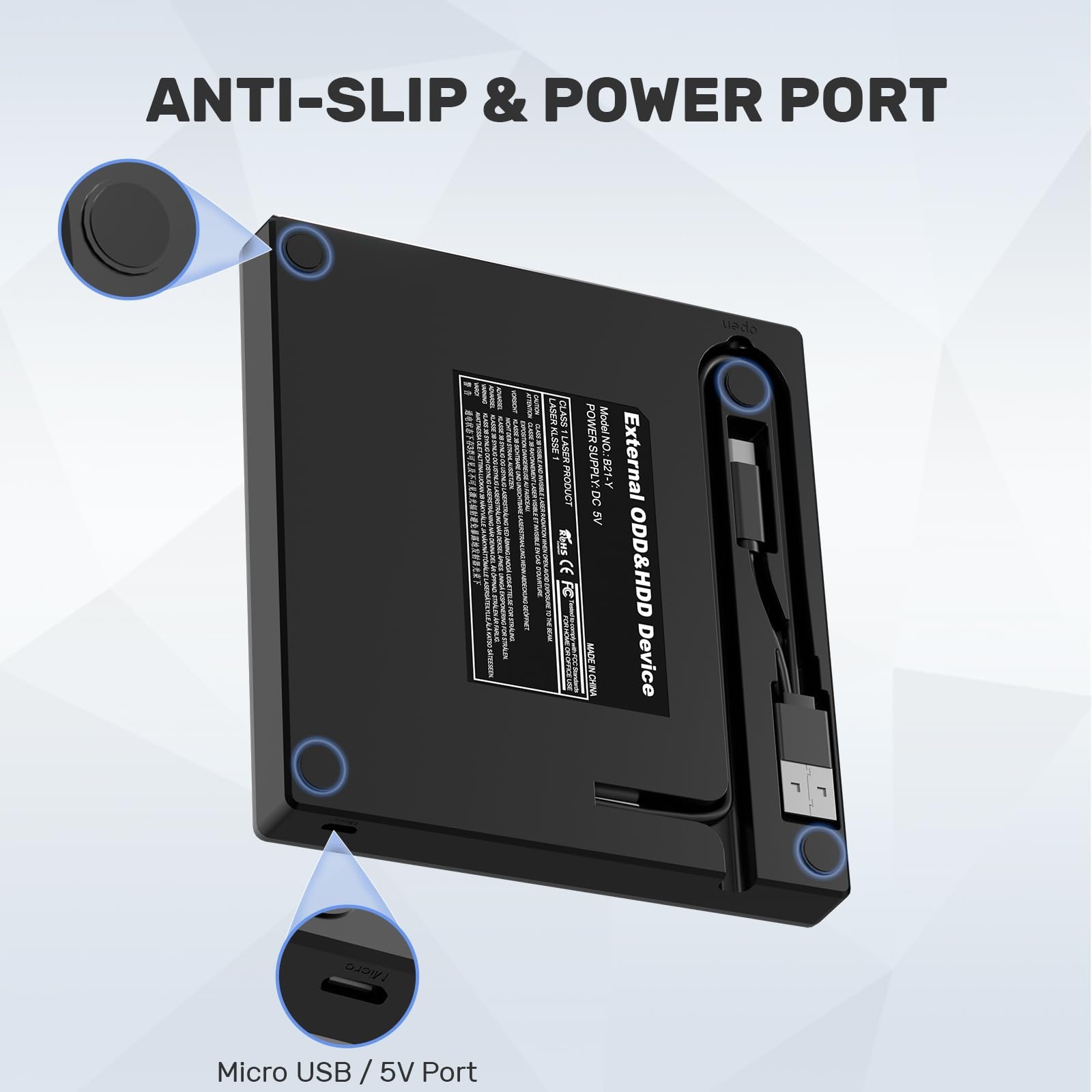 【Plug and Play】- The main connection cable that includes both USB-A and USB-C interface, just plug it into your laptop and the DVD driver will be detected. Don’t need to install software to set up the driver.The main connection cable is stored at the bottom of the product.