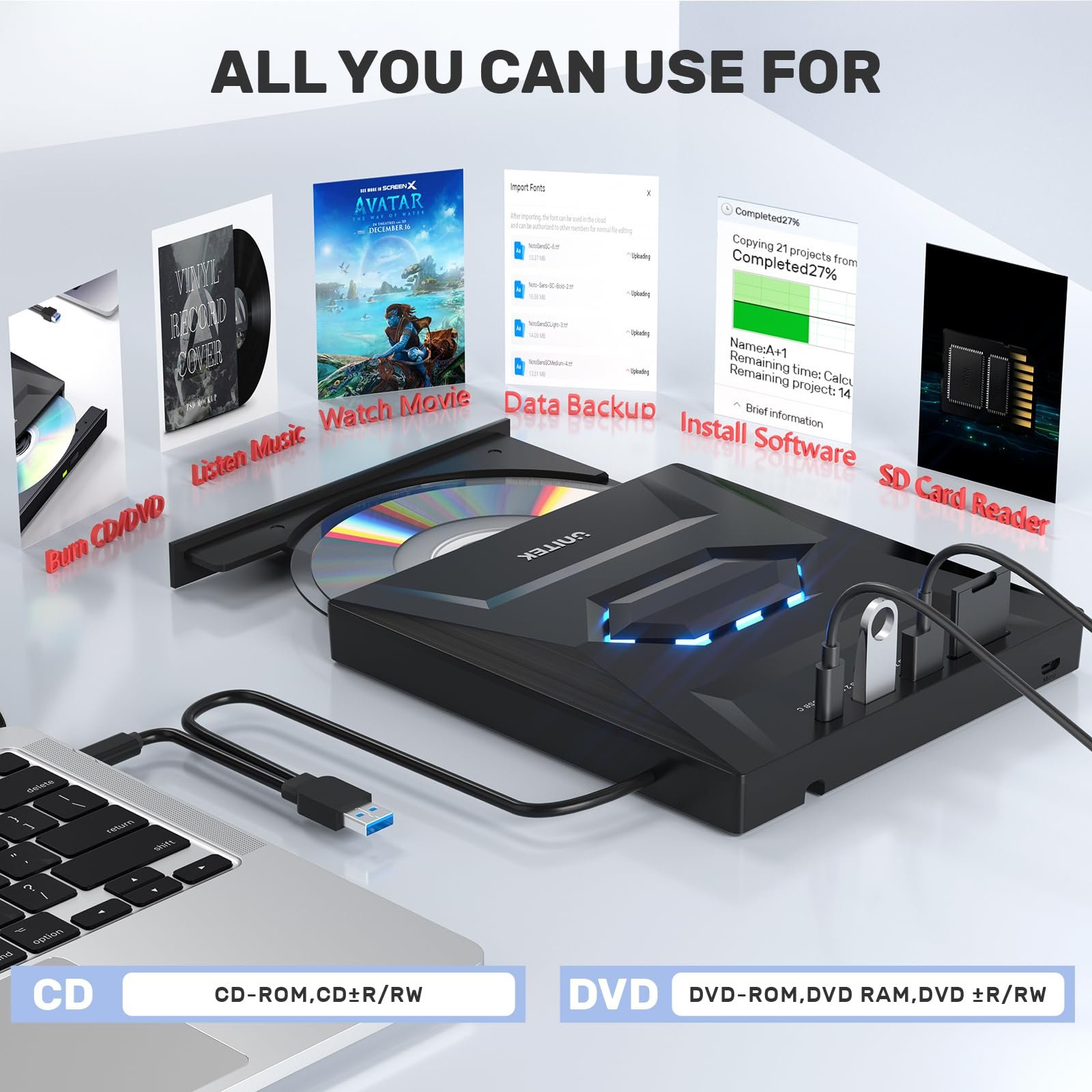 【5 IN 1 Optical Drive】- The Unitek external optical drive not only read CD DVD, but also can be used as an external laptop USB hub, including 1 USB 3.0 port, 1 USB 2.0 port, 1 USB C 2.0 port, SD card slot, compatible with USB hard drive, limited/wireless mouse& keyboard, computer radiator and other USB computer accessories. The card slots are perfect for transferring files by your camera from cards to your computer.