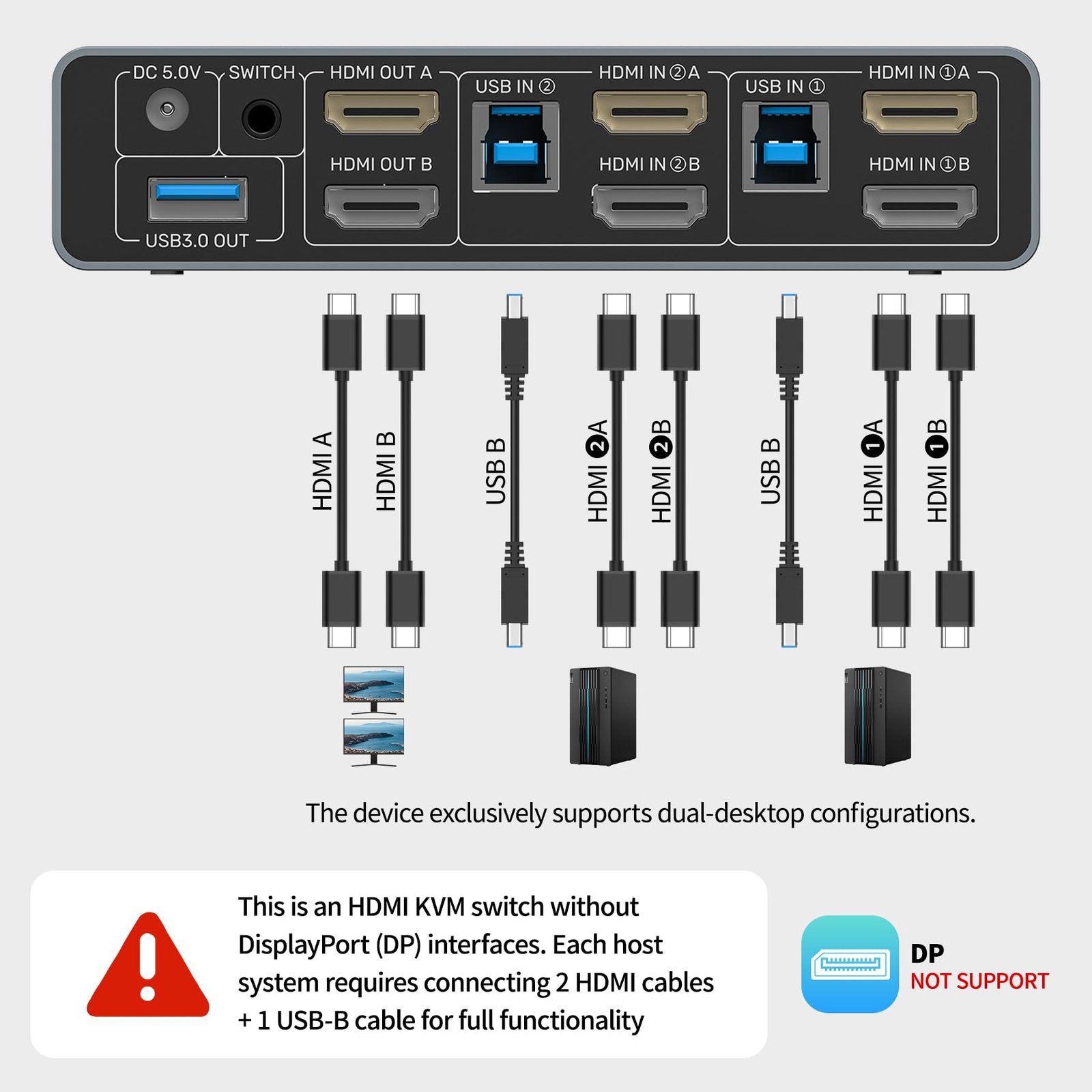 Unitek HDMI KVM Switch 2 Monitors 2 Computers 4K@60Hz USB 3.0 KVM Switches Share Dual HDMI Monitors 3 USB Ports for Keyboard Mouse Hard Drives Mic Headset Ports 2 Cable DC 5V Adapter Controller