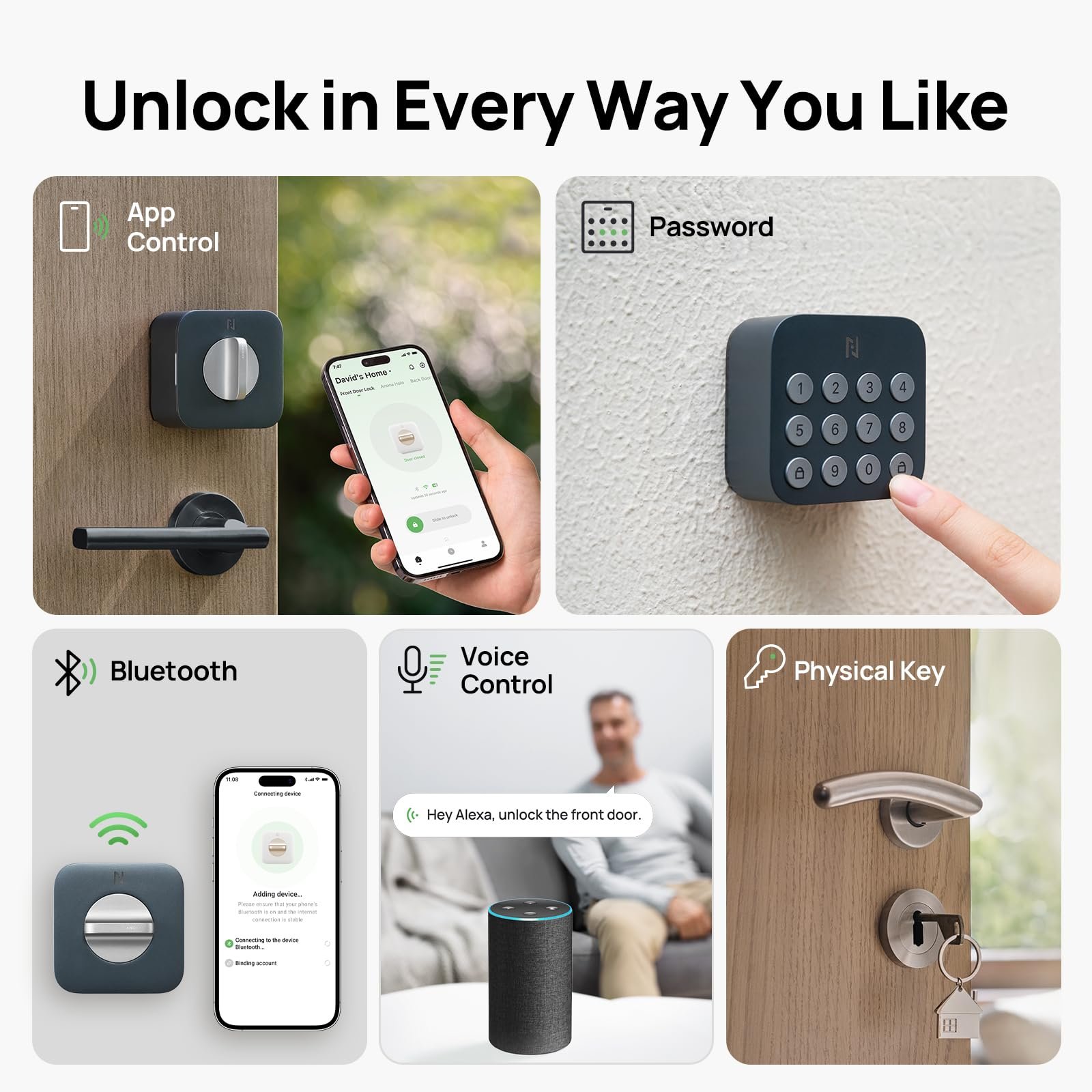 【NO-HUB Matter Ecosystems Support】Anona Holo Smart door lock is compatible with third-party ecosystems like Alexa, Apple HomeKit. Paired with these smart devices, you can easily control your door locks using voice commands, facilitating seamless connectivity within smart home