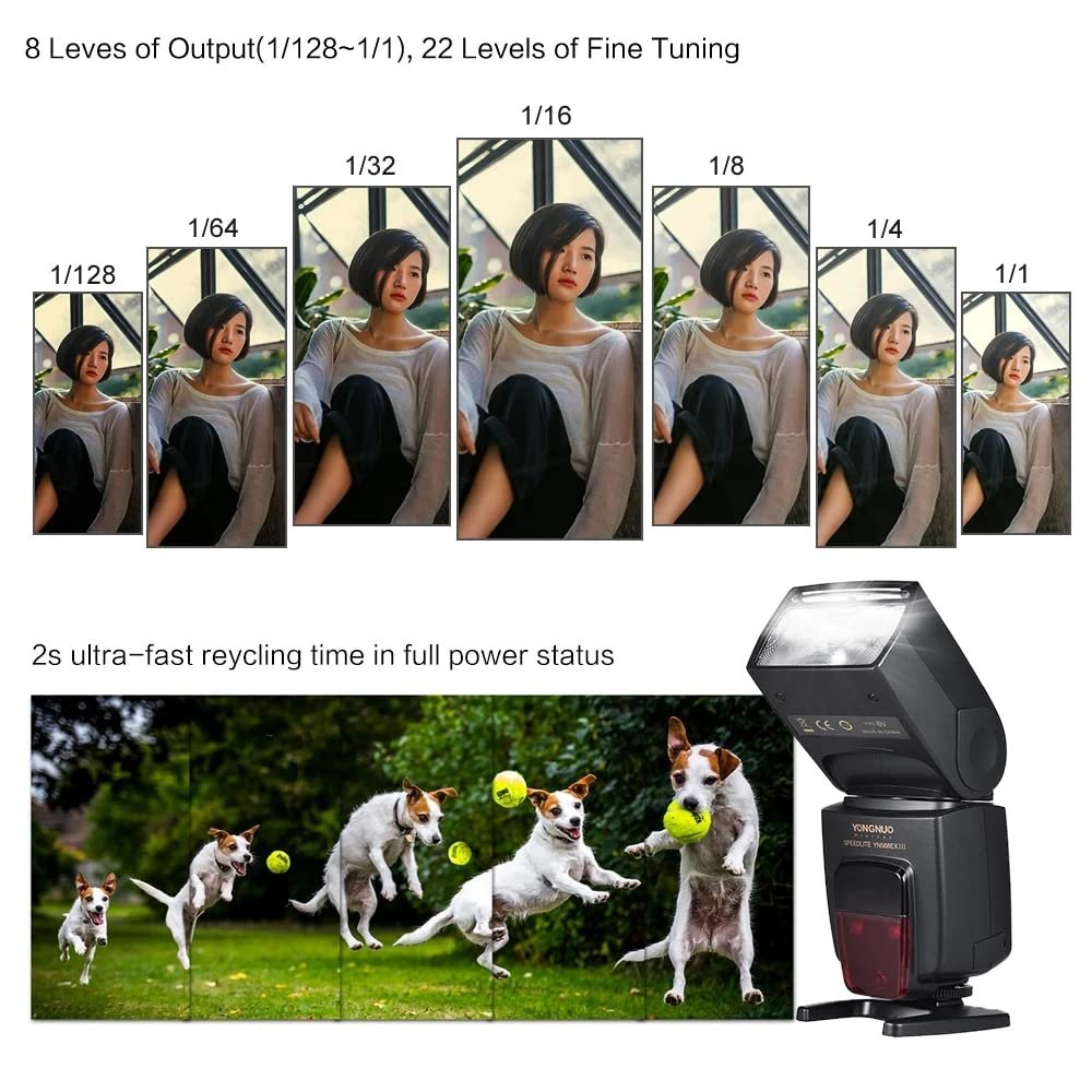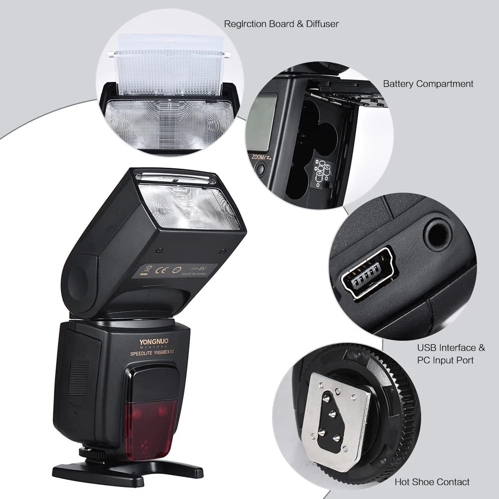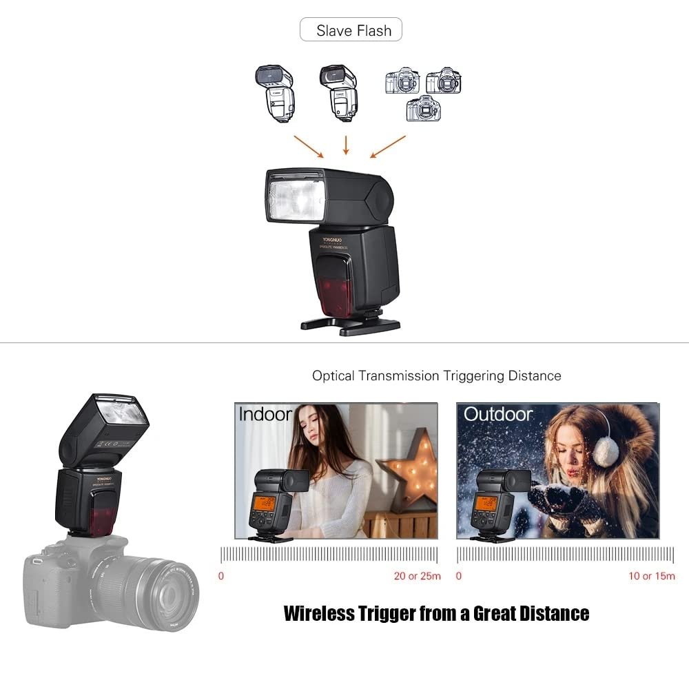 【High Guide Number, Supports TTL HSS】YONGNUO YN568EX III Flash Speedlite, GN58@ISO100, 105mm. Supports TTL, M, Multi flash, with high-speed synchronization function, all shutters are available for shooting, the maximum shutter synchronization speed is up to 1/8000s.