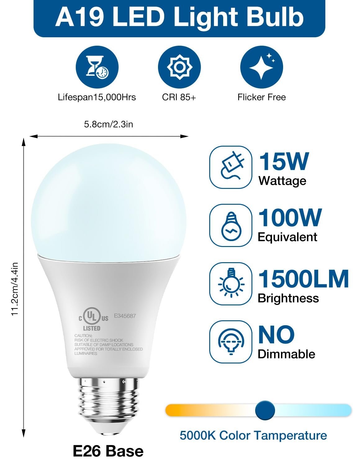 【Eye-care & Eco-friendly】DAYBETTER 5000K daylight light bulbs emit bright white light without buzzing or flickering, effectively protecting vision and health, making them suitable for long-term daily use. DAYBETTER bright white light bulbs contain no harmful substances, including mercury, ultraviolet, or infrared rays, and are harmless to health
