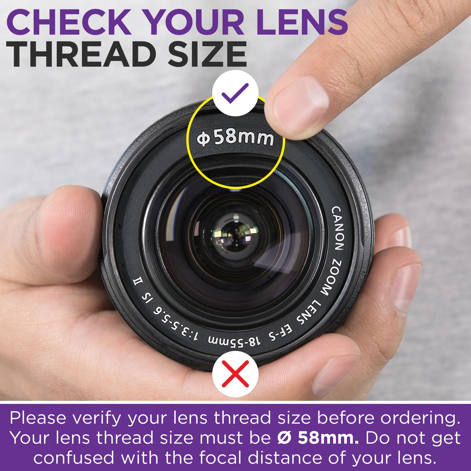 LENS COMPATIBILITIES: Popular 58MM Lens models including Canon EF-S 18-55mm f/4-5.6 IS STM, Canon EF-S 55-250mm f/4-5.6 IS STM, Canon EF 75-300mm f/4-5.6 III USM, Canon EF-S 18-55mm f/3.5-5.6 IS STM, Canon EF 85mm f/1.8 USM, Canon EF 50mm f/1.4 USM, Nikon AF-P DX NIKKOR 70-300mm f/4.5-6.3G ED VR, Nikon AF-S NIKKOR 50mm f/1.8G, Nikon AF-S NIKKOR 50mm f/1.4G, Olympus M.Zuiko Digital ED 40-150mm f/4-5.6 R, Lumix G X Vario 12-35mm f/2.8 II, Fujifilm XC 16-50mm f/3.5-5.6 OIS II