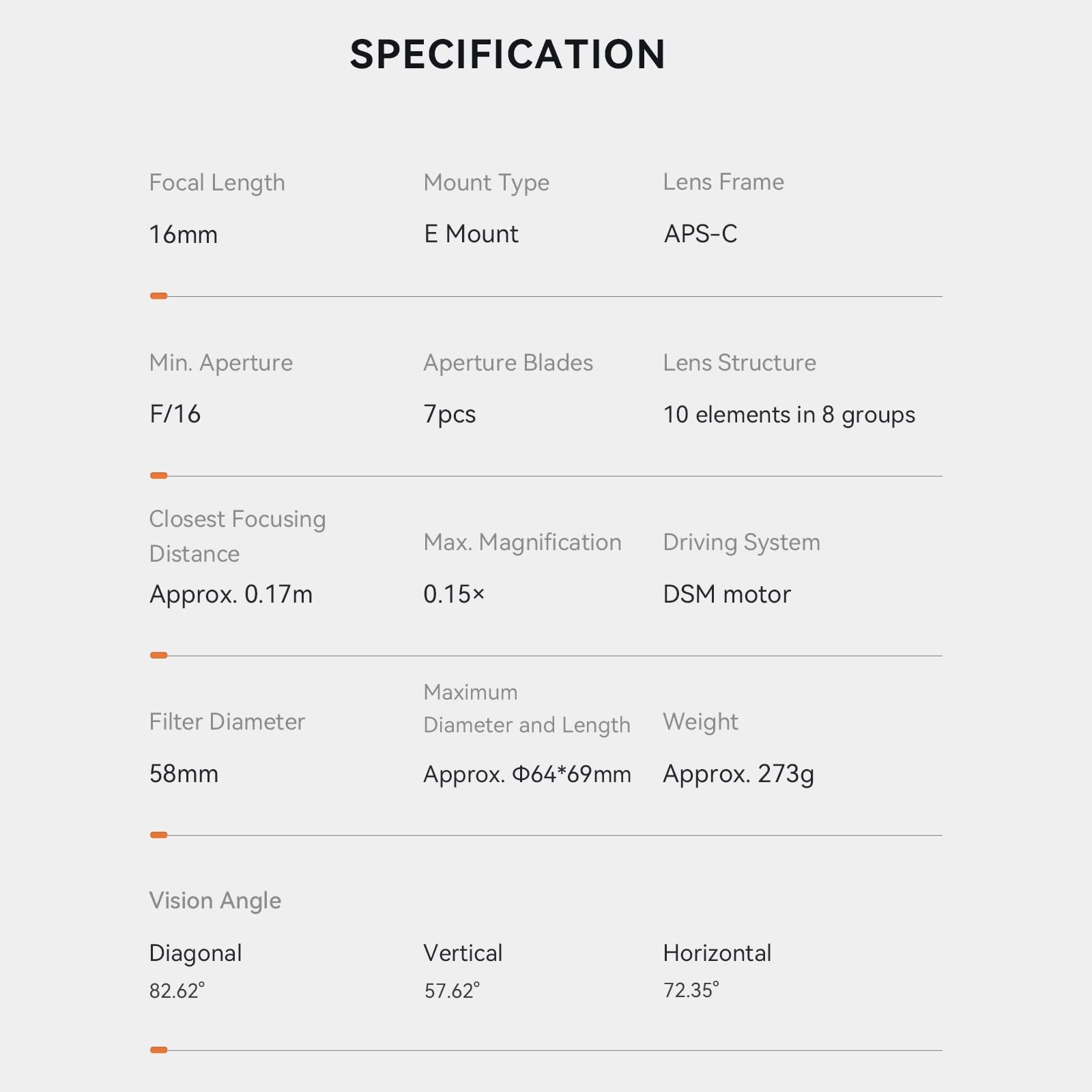 【Features】YN16mm F1.8S DA DSM lens for Sony, F1.8 Large Aperture, 10 elements in 8 groups, 58mm Filter diameter, 7pcs Aperture blades, APS-C frame, support Auto Focus (AF) and Manual Focus (MF).