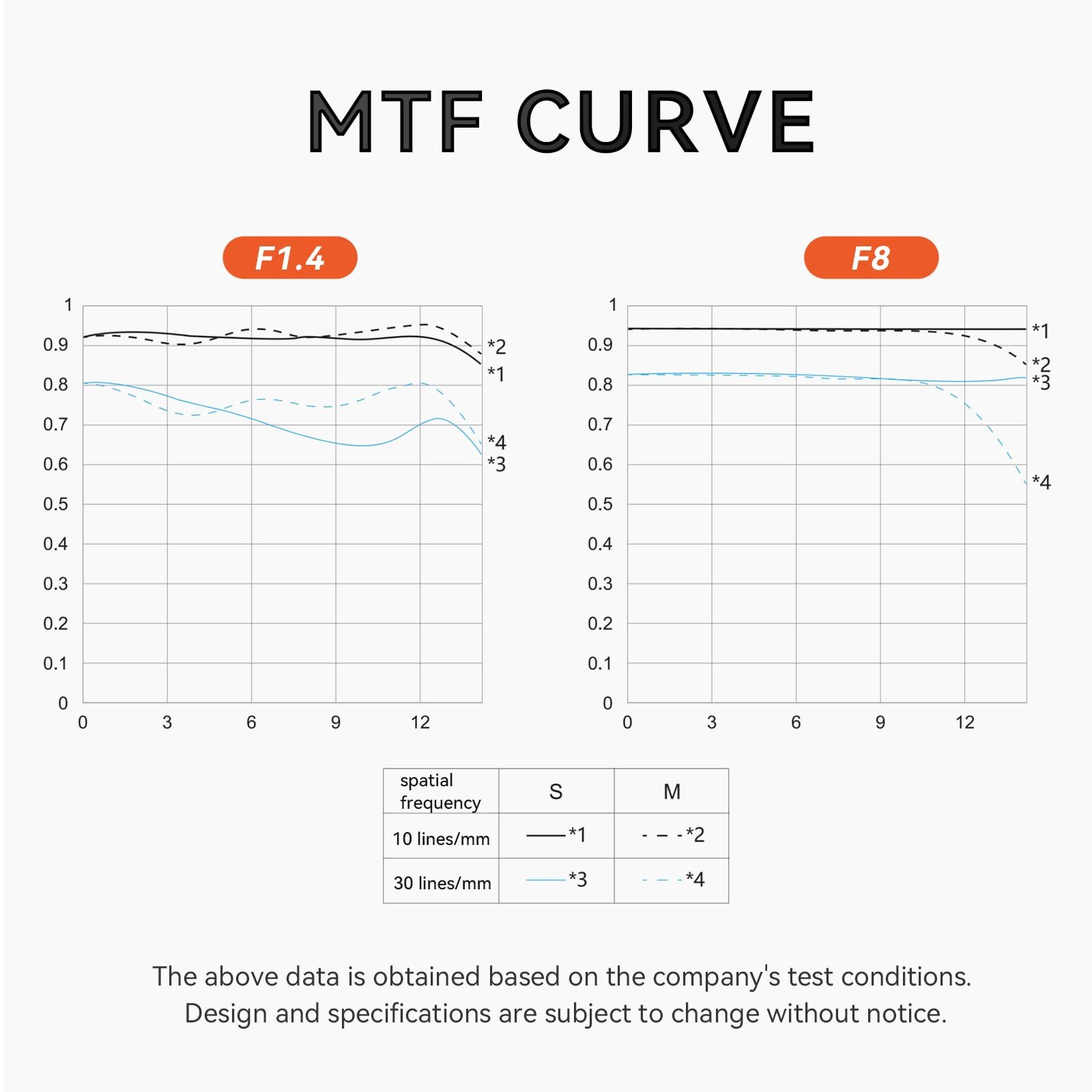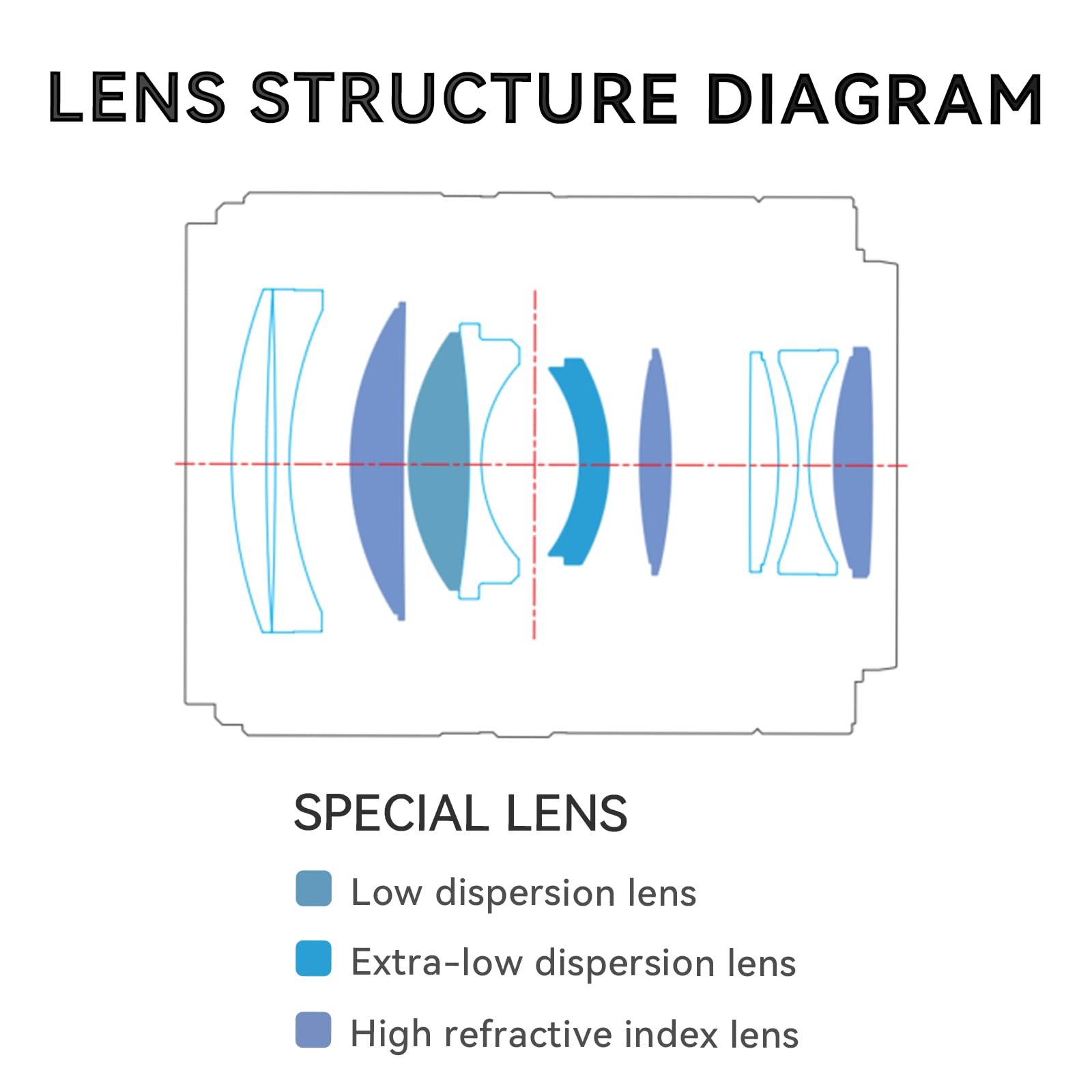 F1.4 Large Aperture, 56mm Focal Length, 11 elements in 9 groups lens construction, 9pcs Aperture Blades, F16 Minimum Aperture, the closest focusing distance is 0.4m, 58mm filter diameter, maximum diameter and length is 69x89mm