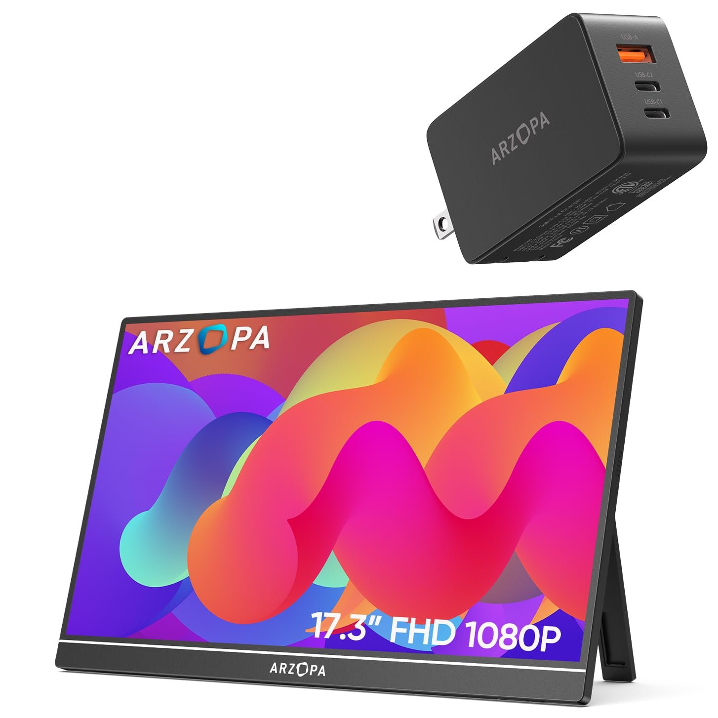 ARZOPA 17.3″ Portable Monitor & 65W USB C Charger Block, 1080P FHD 100% sRGB IPS Gaming Monitor Laptop Monitor & GaN Fast Charger 3-Port Power Adapter Compact Foldable Plug