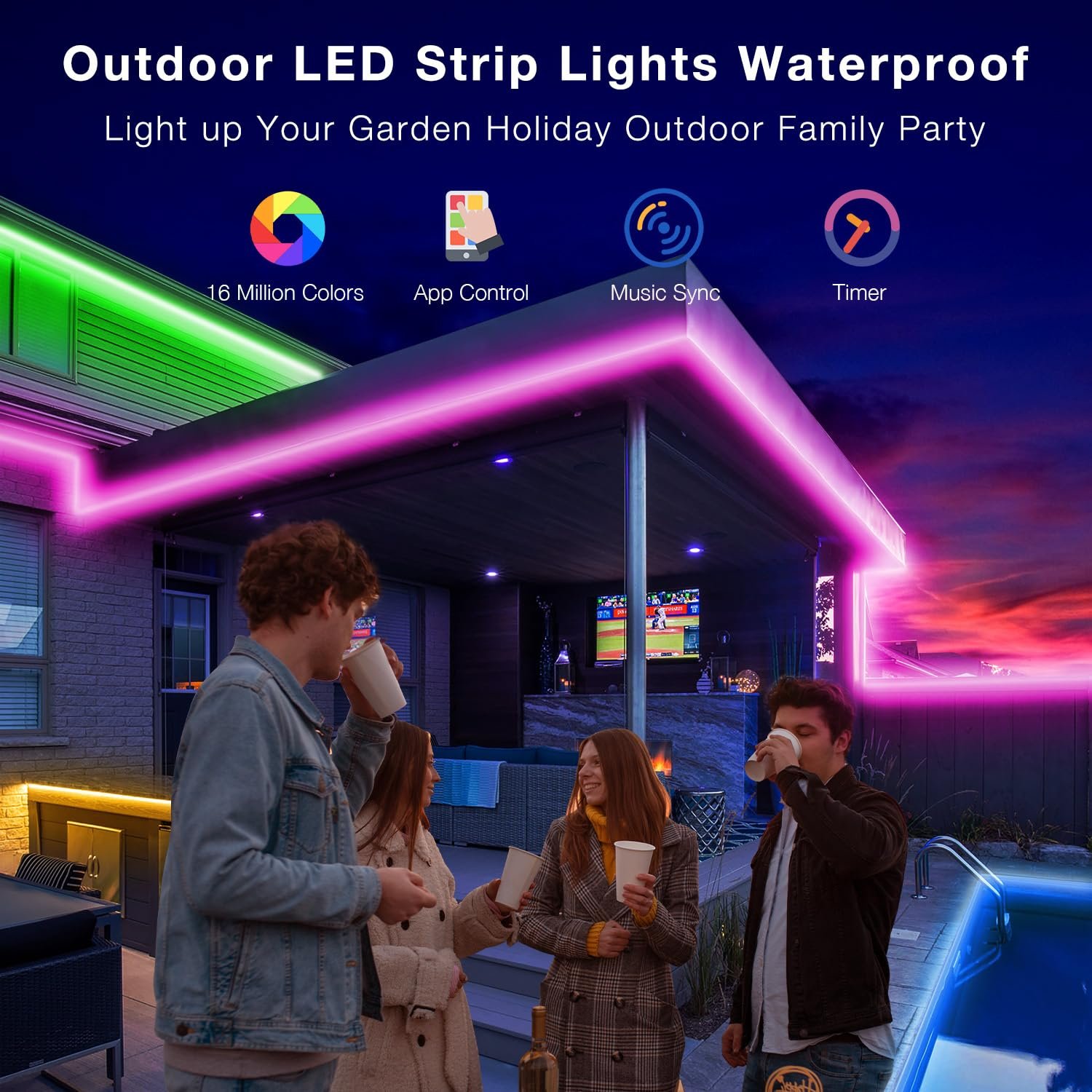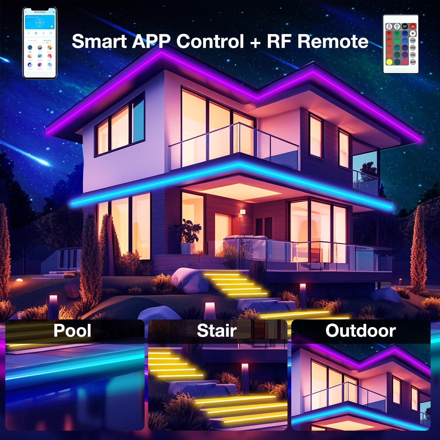 Dual Control Outdoor Led Light: Scan the QR code on the control box, then download the Daybetter app, you can control the led strip from your phone, it also comes with an IR remote, there are lots of options and operating modes, music sync, adjust brightness, change colors, timer function and other functions, easy and fun.(Doesn’t support Alexa voice control)
