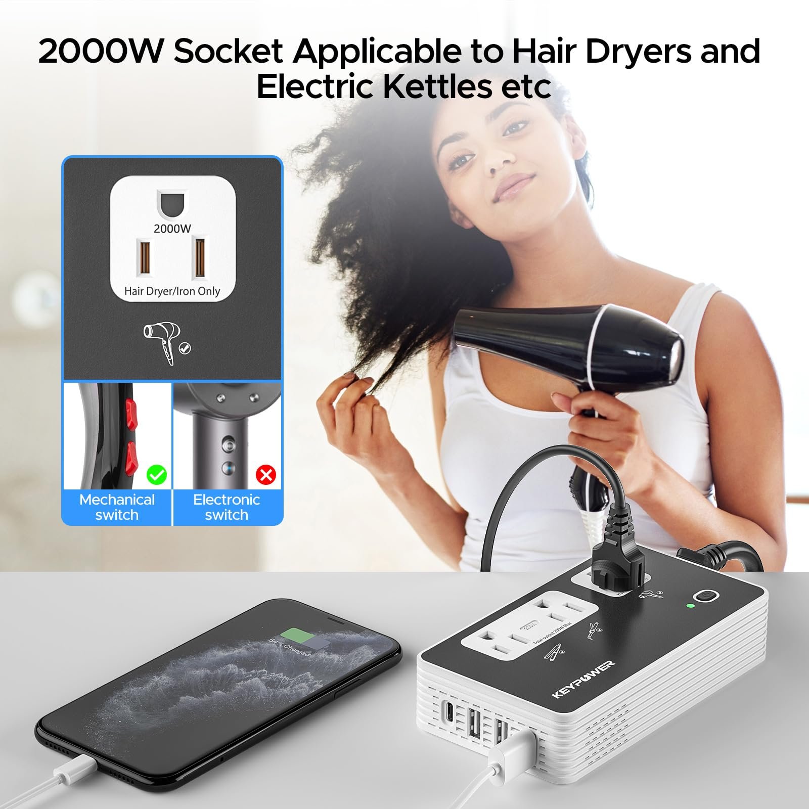 Upgraded 2000W Travel Voltage Converter: Key Power upgraded voltage converter is designed to meet the charging needs of multiple devices when you are traveling, this 220V to 110V converter has 3 separate outlets, one of the AC outlets has a powerful 2000 watts capacity designed for high power devices such as hairdryers and kettles, and the other 2 AC outlets support The other 2 AC outlets support wide voltage 100-240V input devices up to 200W, perfect for low power devices such as laptops, ipads, hair straighteners and more.