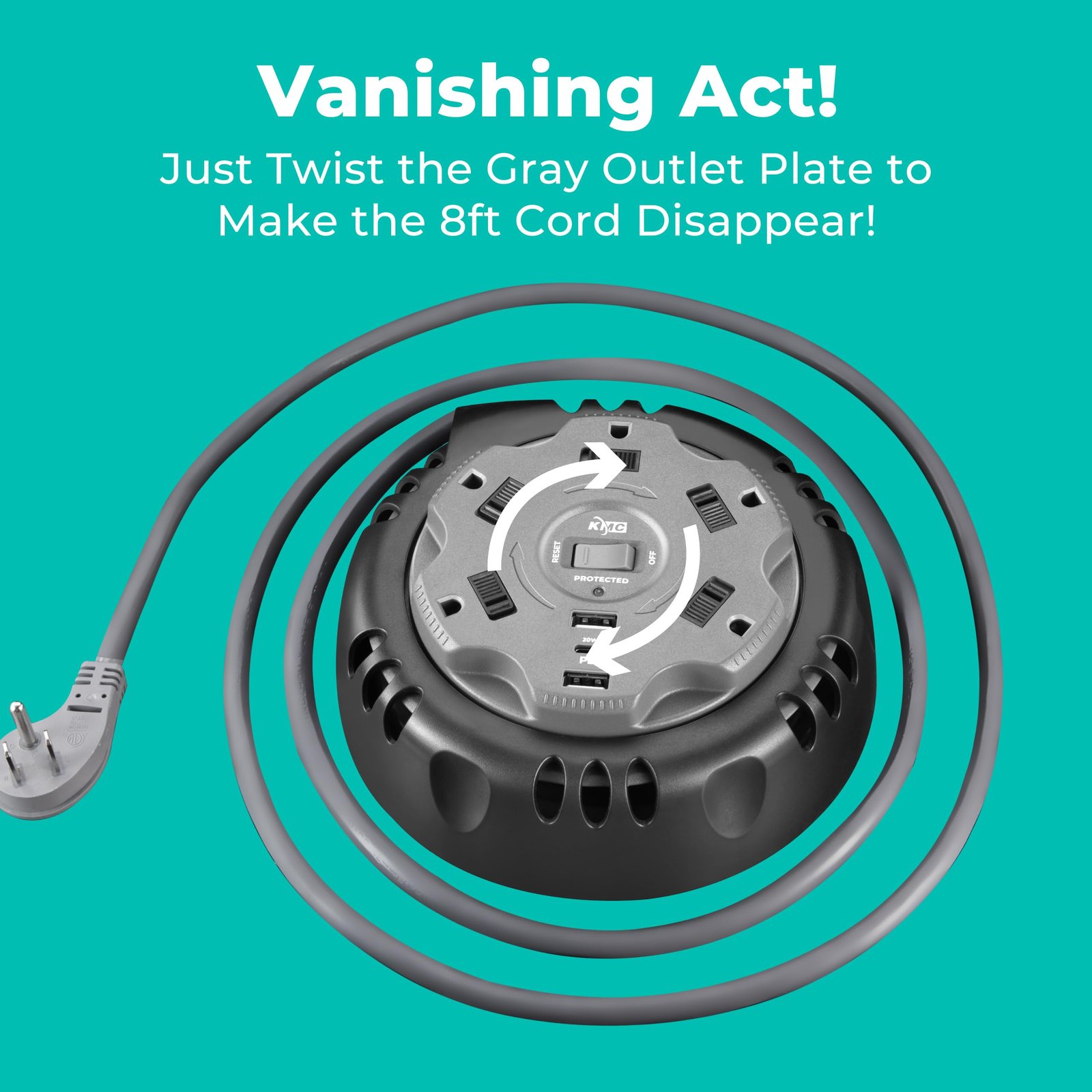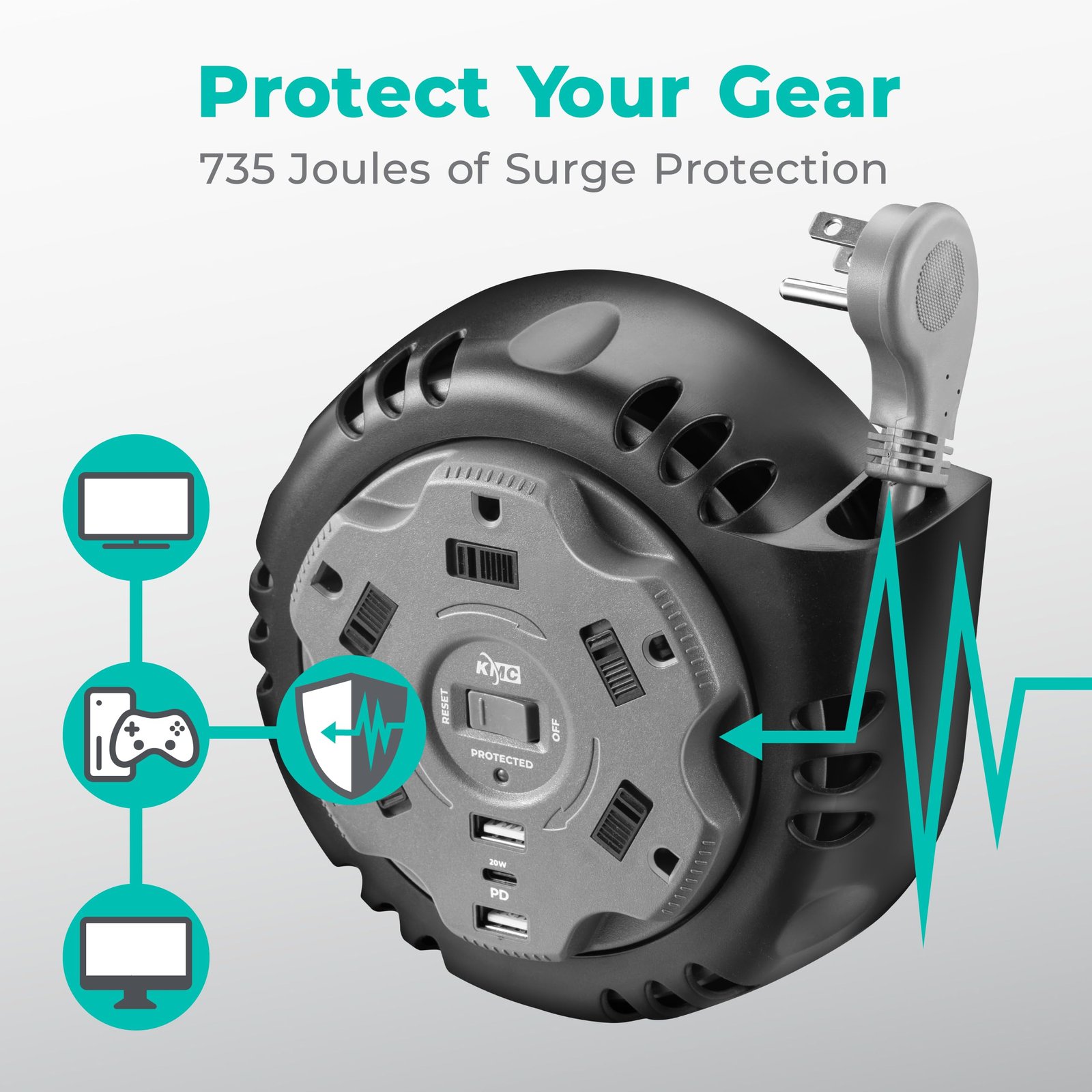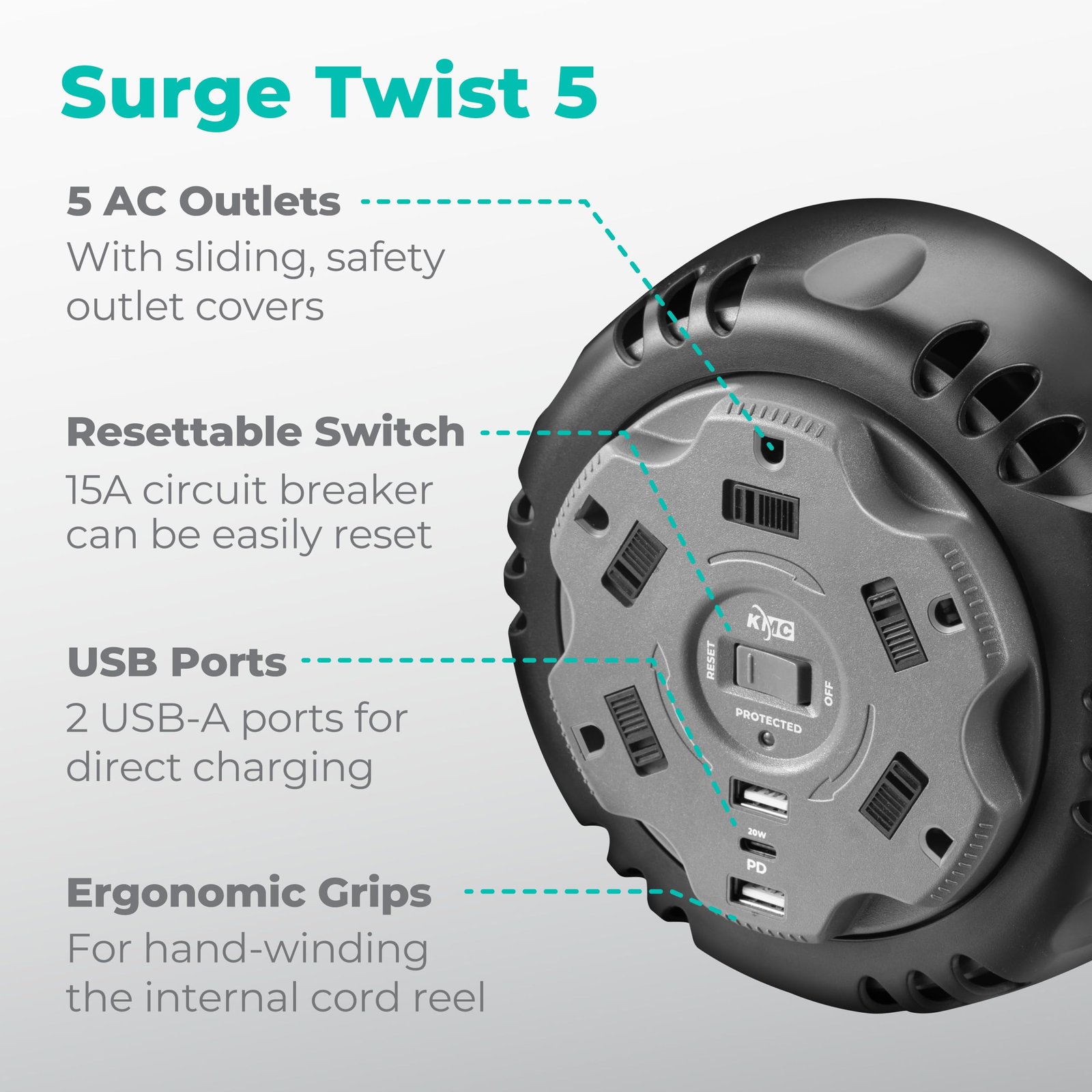 KMC 5-Outlet USB-C PD Surge Twist Retractable Power Strip Cord Reel, 2 USB-A & 1 USB-C Power Delivery, 735J Surge Protector, 8ft Retractable Extension Cord, 3-Prong Flat Plug, UL/ETL Certified, Gray