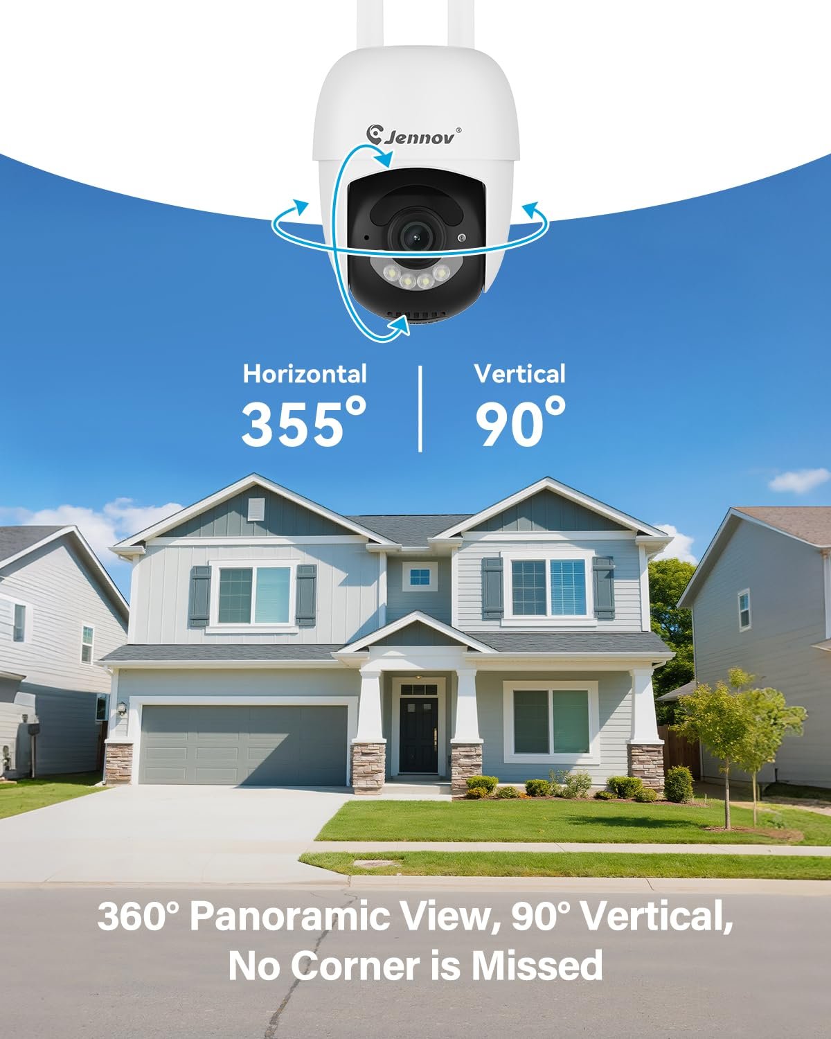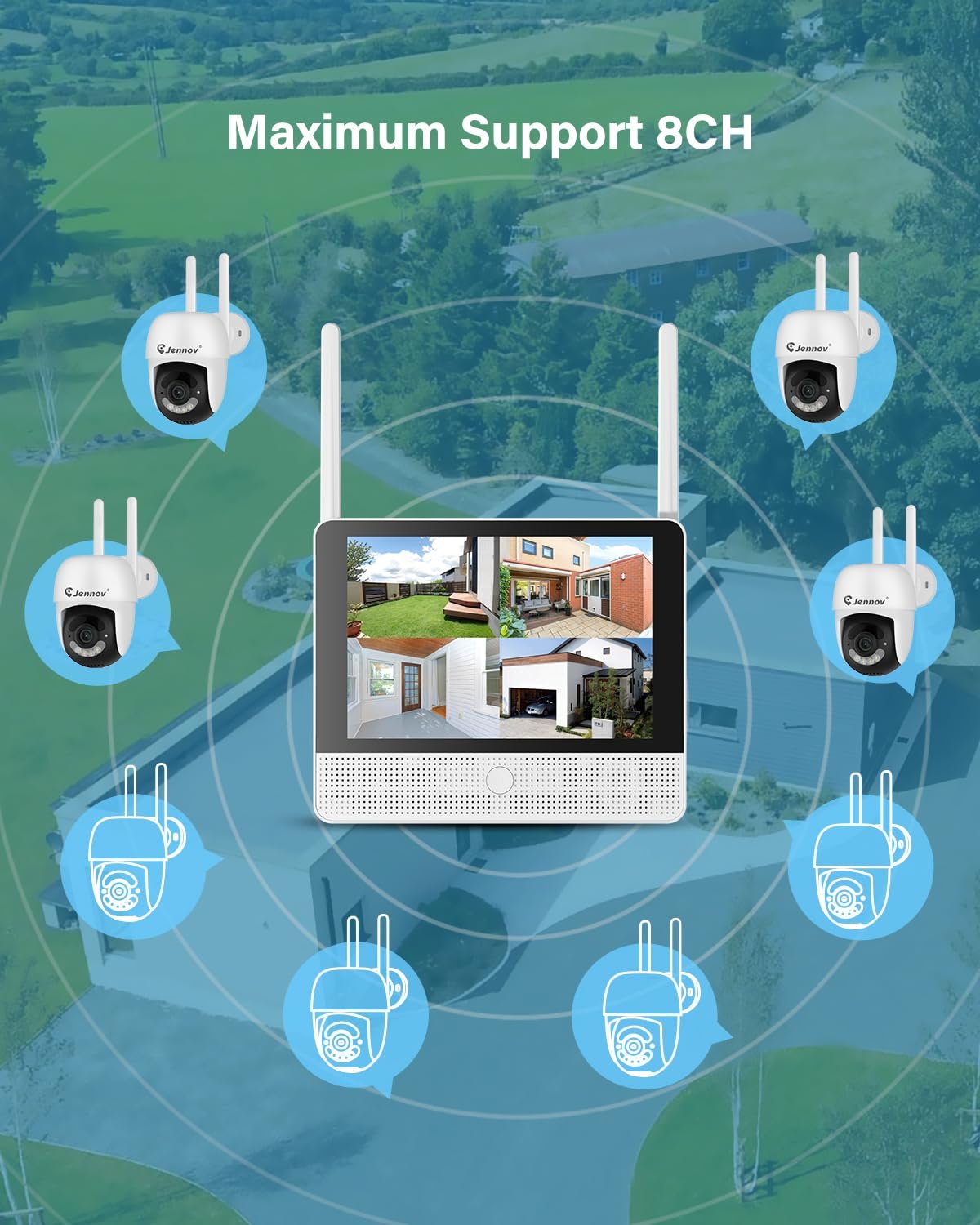 Jennov 5MP Wireless Security Camera System with Monitor – 8CH NVR Kit with 4 Outlet-Powered Cameras, 1TB HDD, Night Vision, Motion Detection, IP66, No Subscription, Home Surveillance Indoor/Outdoor