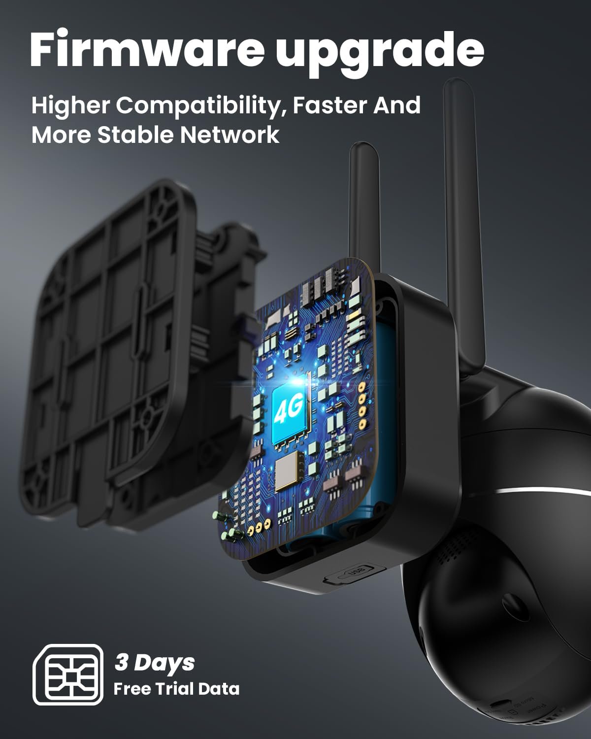 【SIM Card & 7-Day Free Trial】For your convenience, we include a SIM card (already installed in the camera, ready to use, not in the box) with 7 days of free data service. After the initial 7-day trial, you can continue to enjoy unlimited cellular data for only $19.99 monthly. In addition, videos recorded by the camera no wifi needed can be saved to an Memory Card (up to 128G, not included)