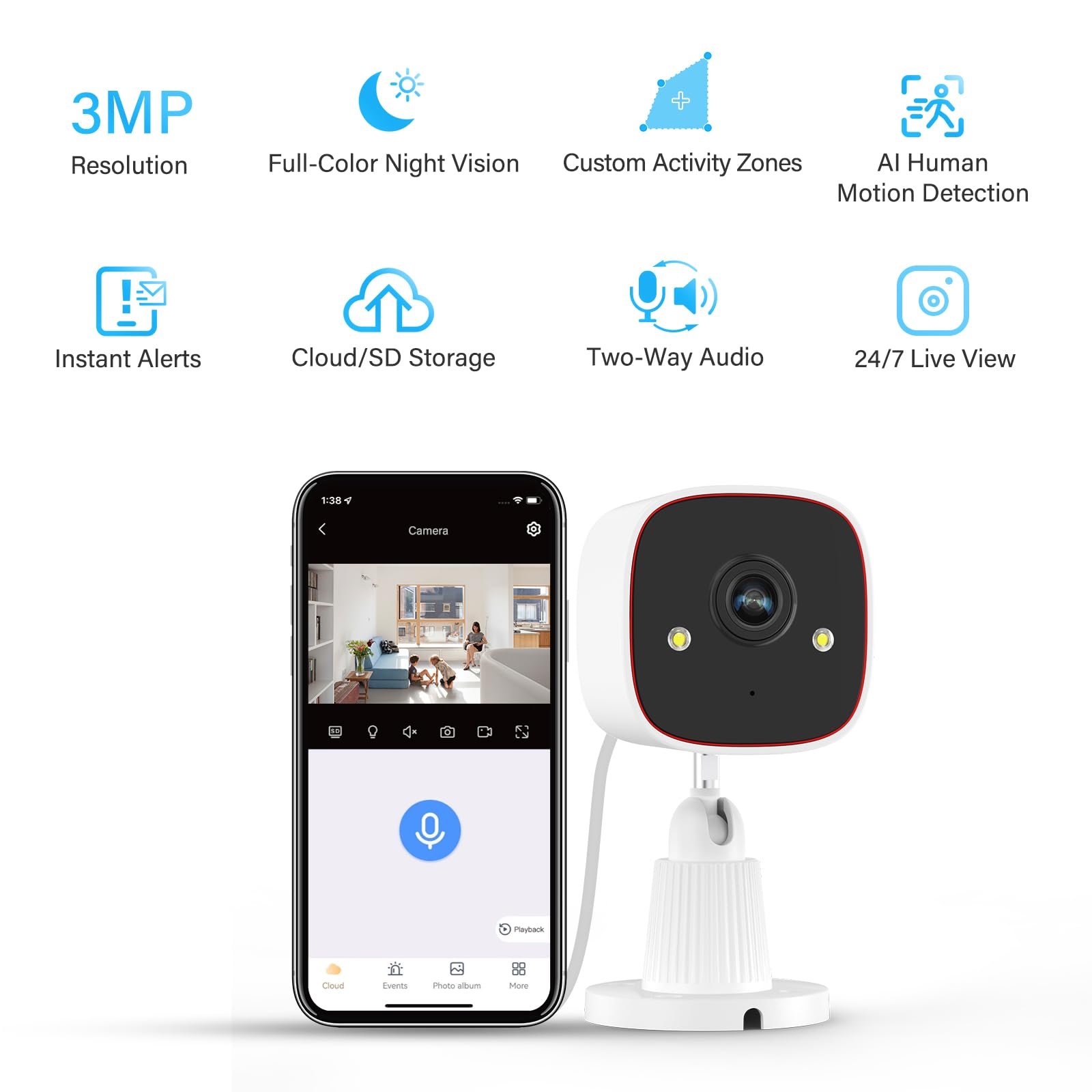 【Wired / Plug-in / Outlet-Powered camera with power cord】【1296P FULL-COLOR NIGHT VISION】The outdoor security camera has 1296p HD pixels and enhanced infrared light and floodlight dual-lamp design, supports three intelligent color night vision modes (infrared, smart, color), and can capture color HD images even at night. At the same time, the Jennov Indoor Camera 2K image will be clearer than 1080p. Jennov security camera is also suitable for indoor/outdoor use due to its excellent waterproof effect. (No Battery Backup)–(Note: subscription required)