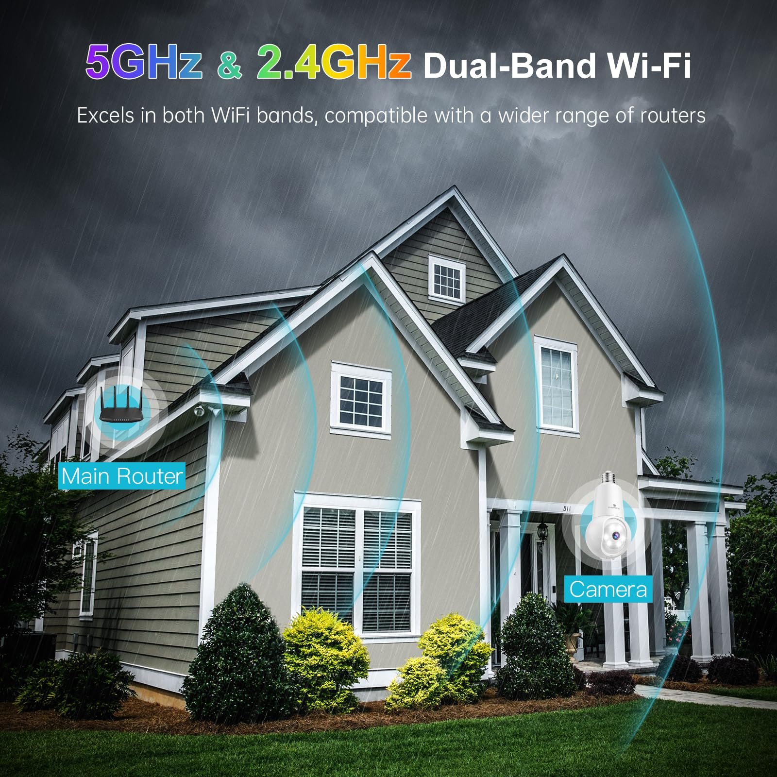 Dual-Band WiFi Compatibility: Supports both 5GHz and 2.4GHz WiFi routers for seamless streaming with light bulb security camera; WiFi signal reception range is extensive, please ensure the camera is installed within the WiFi signal range for uninterrupted security