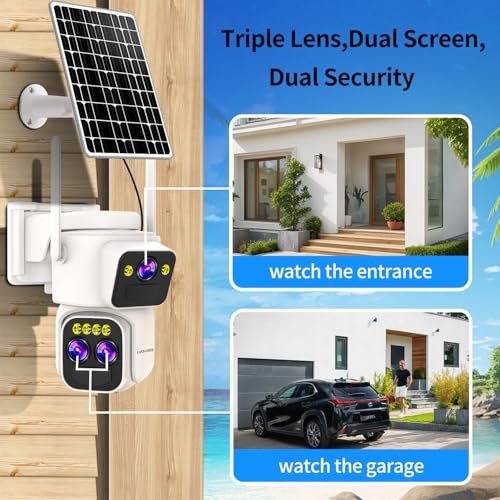 Triple-Lens Solar Security Cameras Wireless Outdoor,360°PTZ Cameras for Home Security with 10x Hybrid Zoom,5G/2.4G WiFi,No Month Fee,PIR Alarm,Full Color Night Vision, Two-Way Audio,IP65