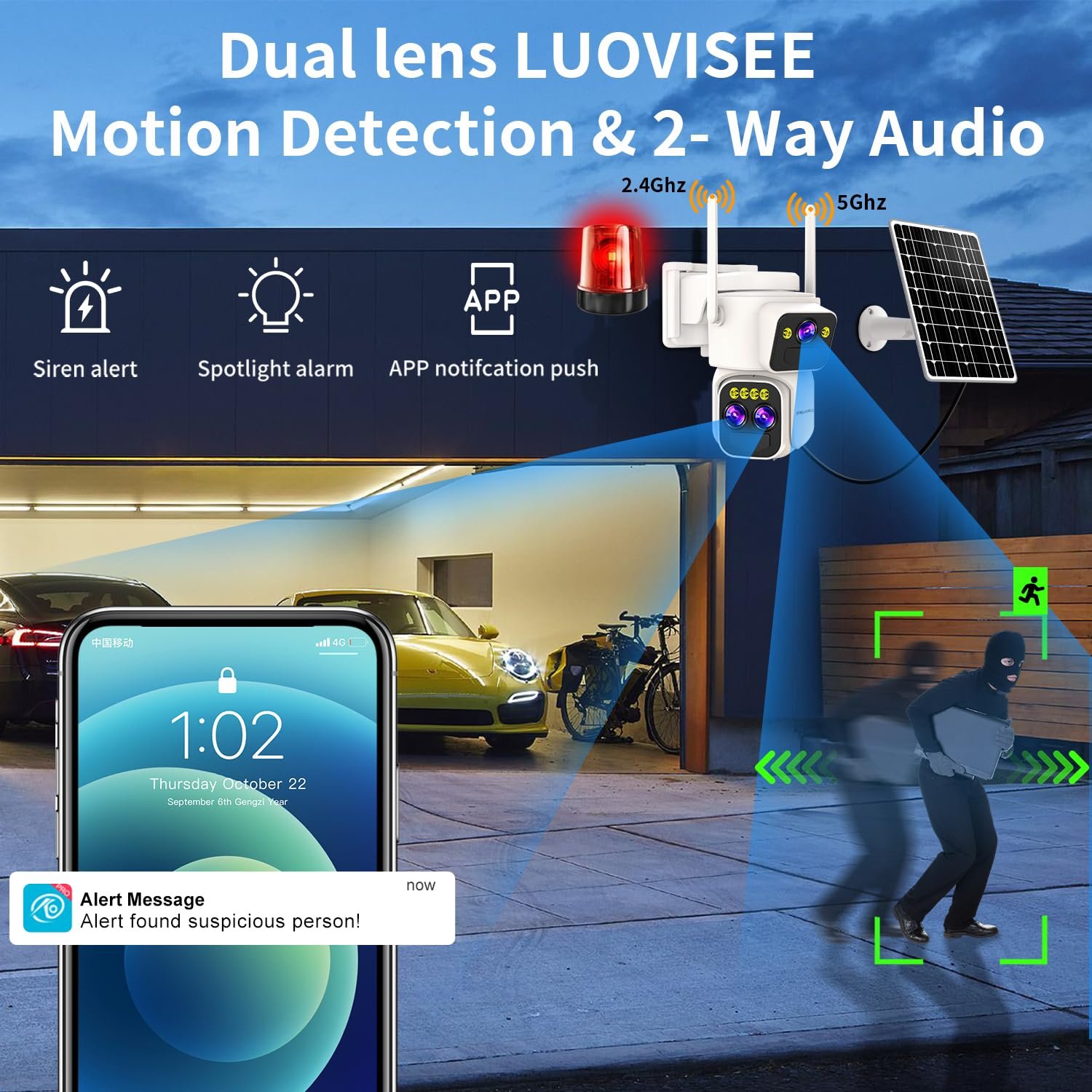 【Easy Use & Solar Powered & Dual-band WiFi】The wireless solar security camera outdoor is equipped with a solar panel and a 5000mAh high capacity rechargeable battery, just put it under direct sunlight to charge it,Seamless switching of power supply in rainy and cloudy weather,providing 365 days uninterrupted power supply, No need power plug-in,100% wireless. The high gain 5DBi dual antenna supports 2.4g & 5g WiFi, strong anti-interference ability, good wall penetration, and more stable and powerful signal transmission.